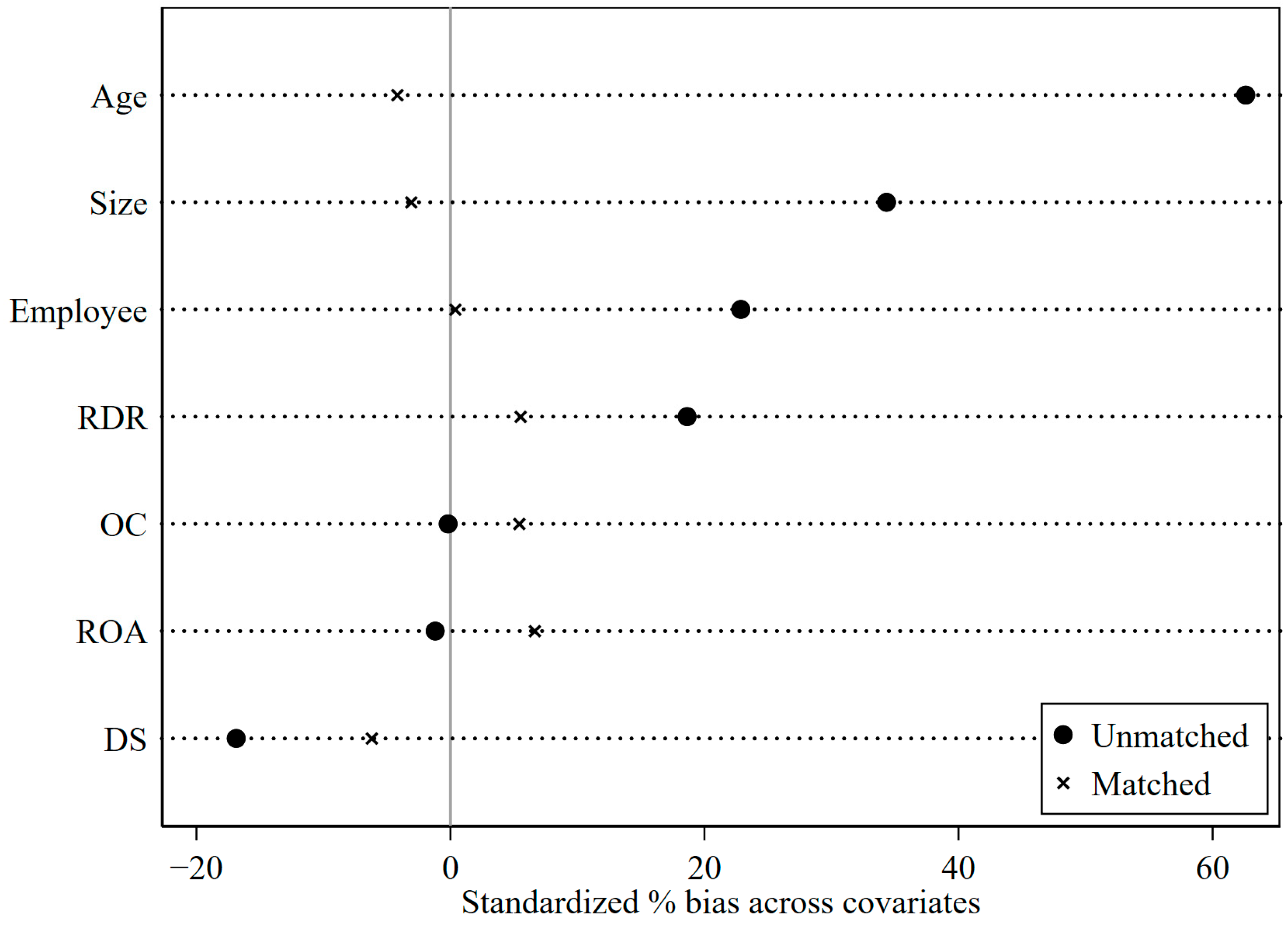 Figure 3, the vertical axis represents the selected covariates, while the horizontal axis displays the standardized bias across covariates. The standardized deviations of all covariates are below 10% after matching. What is more,