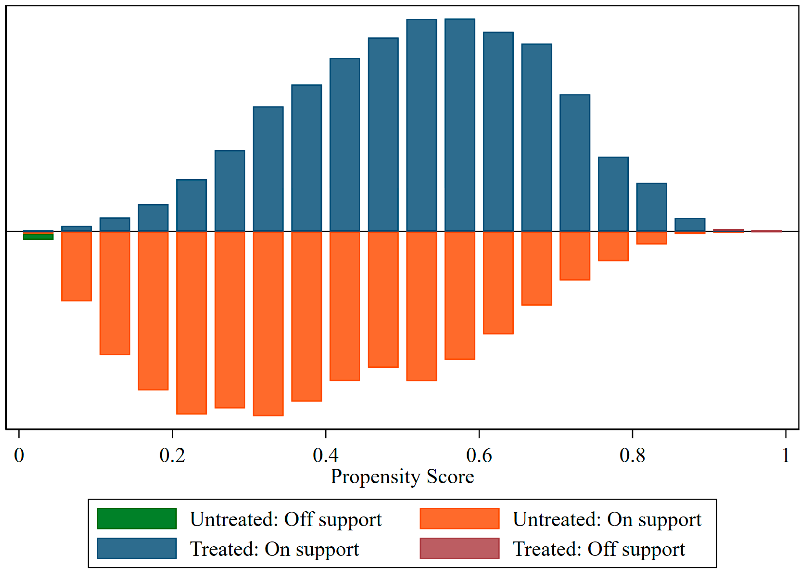 Figure 4 presents the results of the common support hypothesis test. The horizontal axis displays propensity scores, while the vertical axis shows density. The blue column indicates successfully matched treatment group samples, and the orange column represents selected control group samples. The blue and orange columns exhibit high overlap in the mid-range of propensity scores. The results above indicate a satisfactory matching effect.