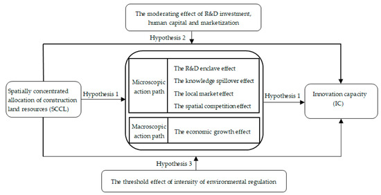 Thirdly, there is the local market effect. SCCL will lead to the agglomeration of diverse-demand populations and industrial economic activities in central cities, forming a local market effect and stimulating innovation [28,29]. On the one hand, large-scale local diversified market demand can provide enterprises with a broad market space, which spurs enterprises to actively innovate, augment investment in R&D, develop new products and conduct research on new technologies to meet the diversified demands of the local market. At the same time, diversified market demand will also give birth to new enterprises and foster various new business forms. On the other hand, a large-scale market can provide enterprises with a basis for demand information for technological innovation. A large number of diverse local consumers can provide timely feedback to enterprises, and enterprises can improve their products based on the feedback information, thereby stimulating continuous innovation.