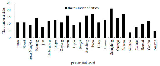 This study calculates the annual provincial SCCL, encompassing 23 provinces and 273 cities. The distribution of the number of cities in each province is presented in Figure 3. Specifically, this study initially excludes China’s four centrally administered municipalities (Beijing, Tianjin, Shanghai, and Chongqing) and the Hong Kong and Macao regions. Second, it excludes provinces and autonomous regions where the number of cities is small or data is seriously missing, including Hainan Province, Qinghai Province, Taiwan Province, Xinjiang Uygur Autonomous Region, and Tibet Autonomous Region. Data are collected over the period 2000–2022, with a total of 529 observational samples. The innovation data are derived from the “Chinese Patent Database” under the State Intellectual Property Office (SIPO). The data on built-up area are from the “China Urban Construction Statistical Yearbook.” The data for the remaining variables mainly come from the “China Statistical Yearbook,” “China Industrial Statistical Yearbook,” “China Environmental Statistics Yearbook,” and the CSMAR Database in China. The basic statistics of the variables adopted in this study are presented in Table 1.