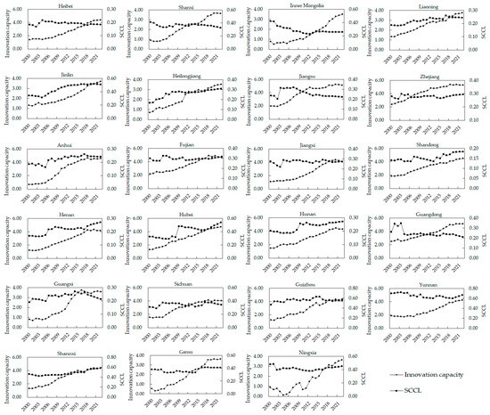 Second, regarding the co-evolution of the SCCL and IC in most provinces, such as Liaoning, Jilin, Hei longjiang, Anhui, Hunan, Sichuan, Guizhou, Shaanxi, Shandong, and Guangxi, they show a co-evolutionary trend. In a few provinces, such as Hebei, Inner Mongolia, Jiangsu, and Guangdong, the SCCL and IC move in opposite directions. In some provinces, there is a complex relationship between the SCCL and IC, with both co-evolutionary and counter-evolutionary trends. For example, in Shanxi Province, the two indicators showed a co-evolutionary trend from 2000 to 2014, but a counter-evolutionary trend after 2014. In Zhejiang Province, there was a certain counter-evolutionary trend before 2015, but a co-evolutionary trend after 2015. In Gansu Province, there was a counter-evolutionary trend before 2015, but a co-evolutionary trend after 2015. In Yunnan Province, the two indicators showed a co-evolutionary trend from 2000 to 2006 and from 2018 to 2022.