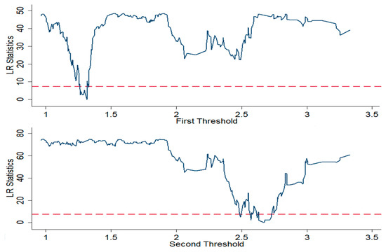 Based on Hypothesis 3, this paper employs a double threshold model as shown in Equation (7) to examine the non-linear characteristics of SCCL on IC under different environmental regulation thresholds.
