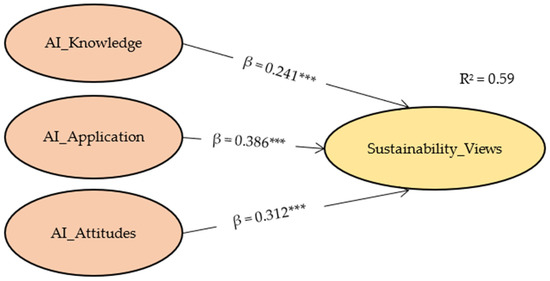 The findings of the structural model are presented in Figure 1, which demonstrates the standardized path coefficients between the latent constructs and the level of significance. All the relationships in the model were found to be significant (p < 0.001) which proves the established hypotheses and demonstrates the stability of the theoretical framework in the concept of Hospitality 5.0. Specifically, the greater impact of the artificial intelligence application (AI_Application) and attitude towards AI (AI_Attitudes) on sustainable values as opposed to the self-perceived knowledge about AI (AI_Knowledge) is emphasized. The standardized path coefficients are statistically strong; however, the interpretation of the results in practical terms has a more profound meaning. The fact that AI knowledge and sustainability perspectives are positively related (r = 0.241, p = 0.001) indicates that a theoretical knowledge of AI tools impacts positively on the awareness of the environmental and ethical concerns in hotels. In a similar manner, the correlation between AI application and sustainability (p = 0.001, r = 0.386) shows that practice-level of AI technology application, including energy management or optimization of digital services, is connected to visible pro-sustainability behavior in students and young professionals. The correlation between AI attitudes and sustainability (r = 0.312, p = 0.001) also demonstrates that value orientations towards AI are motivational and supports sustainability oriented engagement instead of technical competence. Therefore, the statistical associations provide a practical understanding of how the interaction of AI education elements contributes to the development of sustainable mindsets among Generation Z in hospitality education and practice. The structural model explained 59% of the variance in Sustainability Views (R2 = 0.59), indicating moderate explanatory power according to Hair et al. [79].