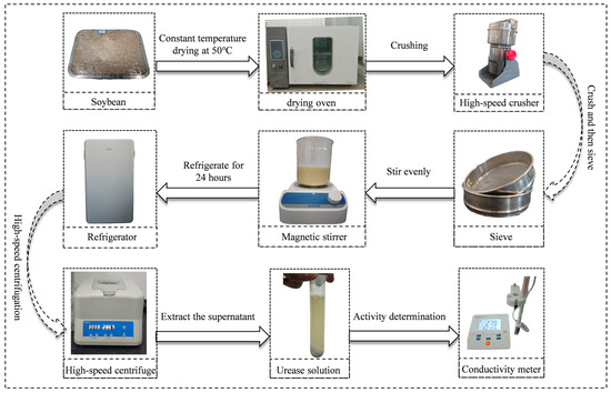 The preparation process of the soybean urease solution is illustrated in Figure 2. Fresh soybeans were first dried in an electric oven at 40 °C, then pulverized using a high-speed grinder and sieved. 100 g of the sieved soybean powder was mixed with deionized water to prepare a 100 g/L solution. The resulting mixture was stored at 4 °C for 24 h to allow complete dissolution of the urease. After refrigeration, the soybean solution was stirred uniformly using a magnetic stirrer for 0.5 h, left to stand, and then sieved again. The filtered solution was poured into centrifuge tubes and centrifuged at 3000 r/min for 30 min. The resulting supernatant constituted the crude soybean urease solution with a concentration of 100 g/L.
