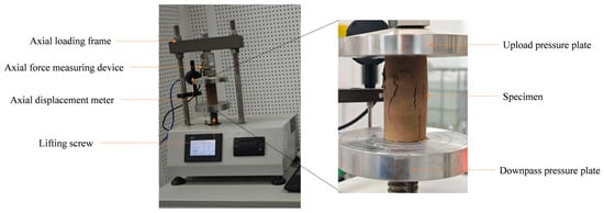 Following the procedures outlined in the Test Methods of Soils for Highway Engineering (JTG 3430-2020) [24], unconfined compressive strength tests were conducted using an unconfined compression testing apparatus (Figure 3), this instrument was purchased from Shengtaike Intelligent Instrument Co., Ltd. in Zhangjiagang, Jiangsu Province, China. An axial load was applied to the specimens at a constant rate of 0.5 mm/min. The unconfined compressive strength was determined as the maximum axial stress reached. The specimens were cured for 7 days, with an enzyme-to-cementation solution ratio of 1:1 and a cementation solution concentration of 1.35 mol/L.