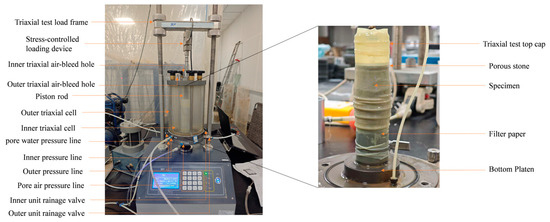 The equipment for triaxial shear tests is purchased from the official website of Nanjing TKA Technology Co., Ltd. in China, a TKA-TTS-1U triaxial testing apparatus (Figure 4) was employed to perform unconsolidated undrained (UU) tests. The shearing rate was set at 0.5 mm/min under confining pressures of 100 kPa, 200 kPa, and 300 kPa. The shear strength parameters (cohesion and internal friction angle) were determined using the Mohr-Coulomb failure criterion. The UU tests in this study aimed to obtain the total stress strength parameters of the compacted Yili loess in its unsaturated state. Given the unsaturated condition of the specimens and the undrained nature of the testing process, the shear strength is governed by the combined effects of matric suction within the soil and interparticle friction.