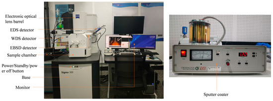 Scanning electron microscopy (SEM) analysis was performed using a field emission scanning electron microscope (Zeiss Gemini Sigma 300) (Figure 5), this equipment was purchased from the official website of Carl Zeiss AG in Germany. Soil specimens from both untreated and EICP-treated loess were prepared for SEM observation. Bulk soil samples measuring 5 mm × 5 mm × 2 mm were dried in an oven at 40 °C for 48 h. After drying, the specimens were sectioned to expose fresh structural surfaces and reduce thickness. To enhance conductivity, the sample surfaces were uniformly sputter-coated with a gold layer before being placed in the SEM chamber for vacuum treatment. The scanning position, focus, and magnification were adjusted to capture images of homogeneous areas at magnifications of 500×, 1500×, and 2000×, obtaining microscopic images at these respective scales.