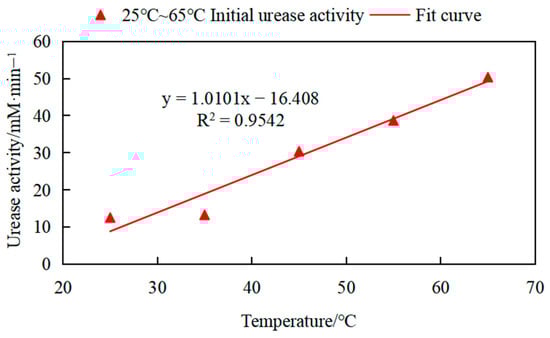The trends of urease activity and CaCO3 production under five different temperatures are shown in Figure 6 and Figure 7, respectively. The results showed that the urease activity increased linearly as the temperature rose. The relationship between the two factors was fitted as follows with the correlation coefficient R2 = 0.9542: