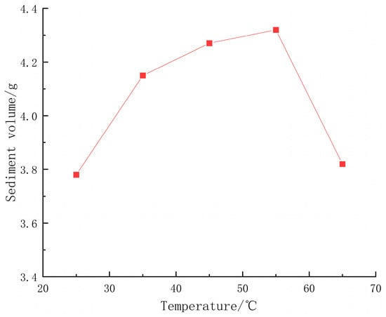 It can be observed in Figure 7 that for a mixture of 100 g/L urease solution and 1.35 mol/L cementing fluid with a 1:1 volume ratio, CaCO3 production increased continuously as the temperature rose. The catalytic efficiency began to slow down above 35 °C and peaked at 55 °C. However, the CaCO3 precipitation rate decreased considerably above 55 °C, indicating a gradual inactivation of urease under high temperatures.