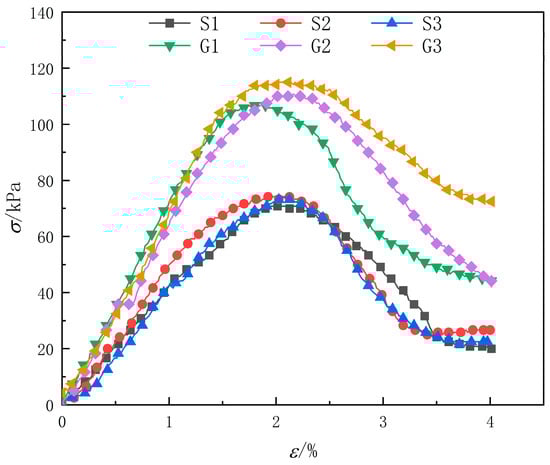 To assess the reliability and repeatability of the test results, three parallel specimens were prepared and tested for each experimental condition (including both untreated soil S and treated soil G). The mechanical property data presented in the text represent the average values of these replicates, with the standard deviation used as a measure of data dispersion.