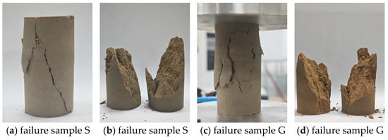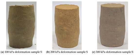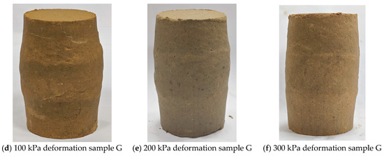 The mechanical responses corresponding to the failure modes of Specimen G and Specimen S demonstrate consistency. Under various confining pressures, the deformation mechanisms of both specimens are predominantly characterized by compressive–lateral bulging deformation (Figure 11). The stress–strain curves exhibit monotonic hardening characteristics without distinct peak points, resulting in a compaction-induced failure mode. The failure pattern manifests as plastic bulging deformation, with no significant rupture or other deformation features observed in the overall specimen morphology. The deformation mechanism is characterized by axial compression coupled with lateral bulging, while maintaining the overall integrity of the specimens. This indicates that under constant other conditions, the EICP solution treatment in Specimen G exerts minimal influence on soil moisture content during the later reaction stages, with the variation in soil strength primarily regulated by the precipitated CaCO3 among soil particles.