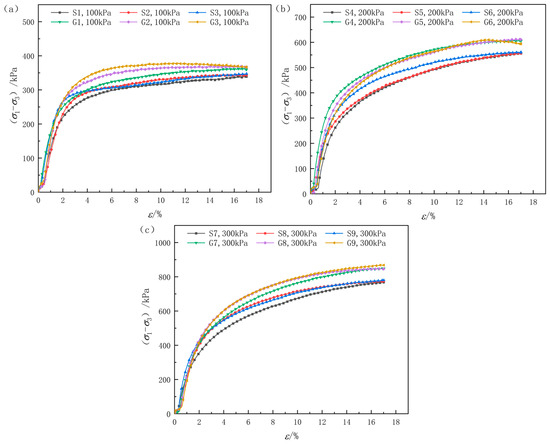 Deviator stress–axial strain curves from triaxial tests. (a) Stress–strain curves of specimens at 100 kPa confining pressure; (b) Stress–strain curves of specimens at 200 kPa confining pressure; (c) Stress–strain curves of specimens at 300 kPa confining pressure.