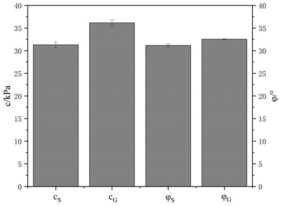 The stress–strain curves of the soil samples were obtained by the triaxial shear test. The peak principal stresses were estimated at each confining pressure for both the plain soil samples (S-type) and the improved samples (G-type). Mohr’s circle was constructed based on these results. Linear fitting was performed according to the Mohr-Coulomb strength criterion. The shear strength parameters (cohesion c and internal friction angle φ) were calculated for the samples of S- and G-types, as shown in Table 4 and Figure 12.