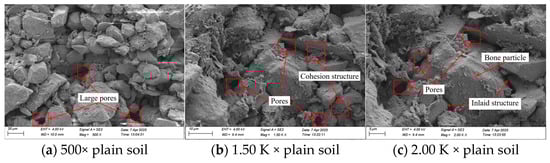 The microstructures of the plain soil (S-type) and the improved soil (G-type) were observed by SEM at multiple scales (500×, 1500×, and 2000×) to reveal the reshaping mechanism of biological improvement for the microstructure of loess deposits from the Yili Basin. The particle morphology was irregular in samples of S-type (Figure 13a–c), and the particles were poorly sorted. Support contacts prevailed between the particles, accompanied by a small amount of mosaic contacts. A massive amount of interparticle pores (both large and small) were generated and weakly cemented. The small particles in the untreated soils were loosely distributed within the pores between the large soil particles. The particle boundaries were distinct, and the edges between individual particles were easily identifiable. There were barely any CaCO3 crystals on the particle surfaces.