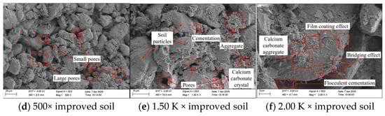 The microscopic contact pattern of the soils had changed (Figure 13d–f), that is, from point-to-point contact to point-to-surface and surface-to-surface contact of soil particles after the improvement. Such a change might have been attributed to the following reasons: (1) Being coated by the cementing agent improved particle roundness, blunting edges and corners; (2) The small soil particles formed secondary aggregates via the CaCO3 bridging agent; (3) The large particles formed composite aggregates via surface contacts. The 2000× images showed that the CaCO3-cemented layer of particles was 0.5–1.2 μm thick, with the particles forming a continuously coated structure (Figure 13f).
