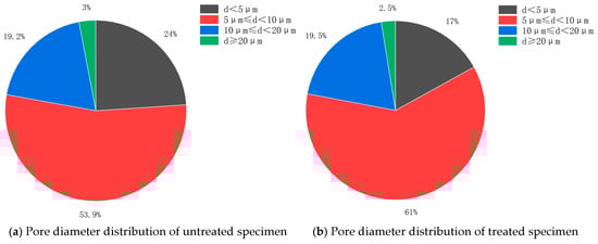 To further elucidate the improvement mechanism of EICP technology, this study conducted quantitative analysis on scanning electron microscopy (SEM) images, specifically investigating the pore structure alterations between untreated soil and EICP-treated soil. The quantitative analysis results are summarized in Table 5, with the corresponding pore size distribution proportions presented in a pie chart format in Figure 14.