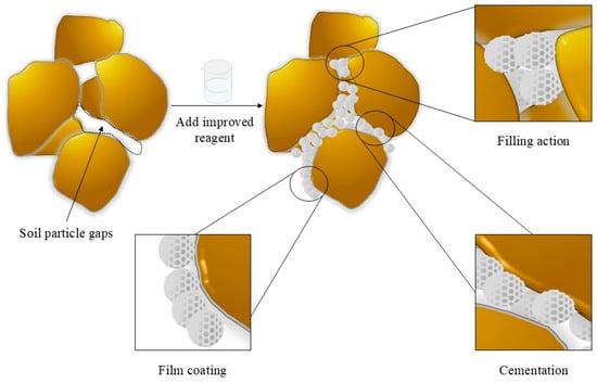 As early as 2003, Nemati and Voordouw [12] proposed using plant-derived free urease as a hydrolysis catalyst, a technique later termed “Enzyme-Induced Carbonate Precipitation (EICP)” by researchers. It was not until after 2010 that EICP technology began to be applied in soil improvement. Hideaki Yasuhara, Debendra Neupane, and others [13] were among the first to apply EICP technology for sand improvement, investigating its effectiveness in enhancing soil mechanical strength and impermeability through numerical simulations and other means. As an emerging biomineralization technology, EICP primarily involves urease extracted from plants and their seeds catalyzing the hydrolysis of urea to produce carbonate ions. These ions then combine with introduced calcium ions to form calcium carbonate precipitates. These precipitates coat soil particle surfaces and fill the spaces between them, thereby enhancing the interparticle bonding force (Figure 1) and consequently improving the soil’s mechanical properties and resistance to seepage [14].