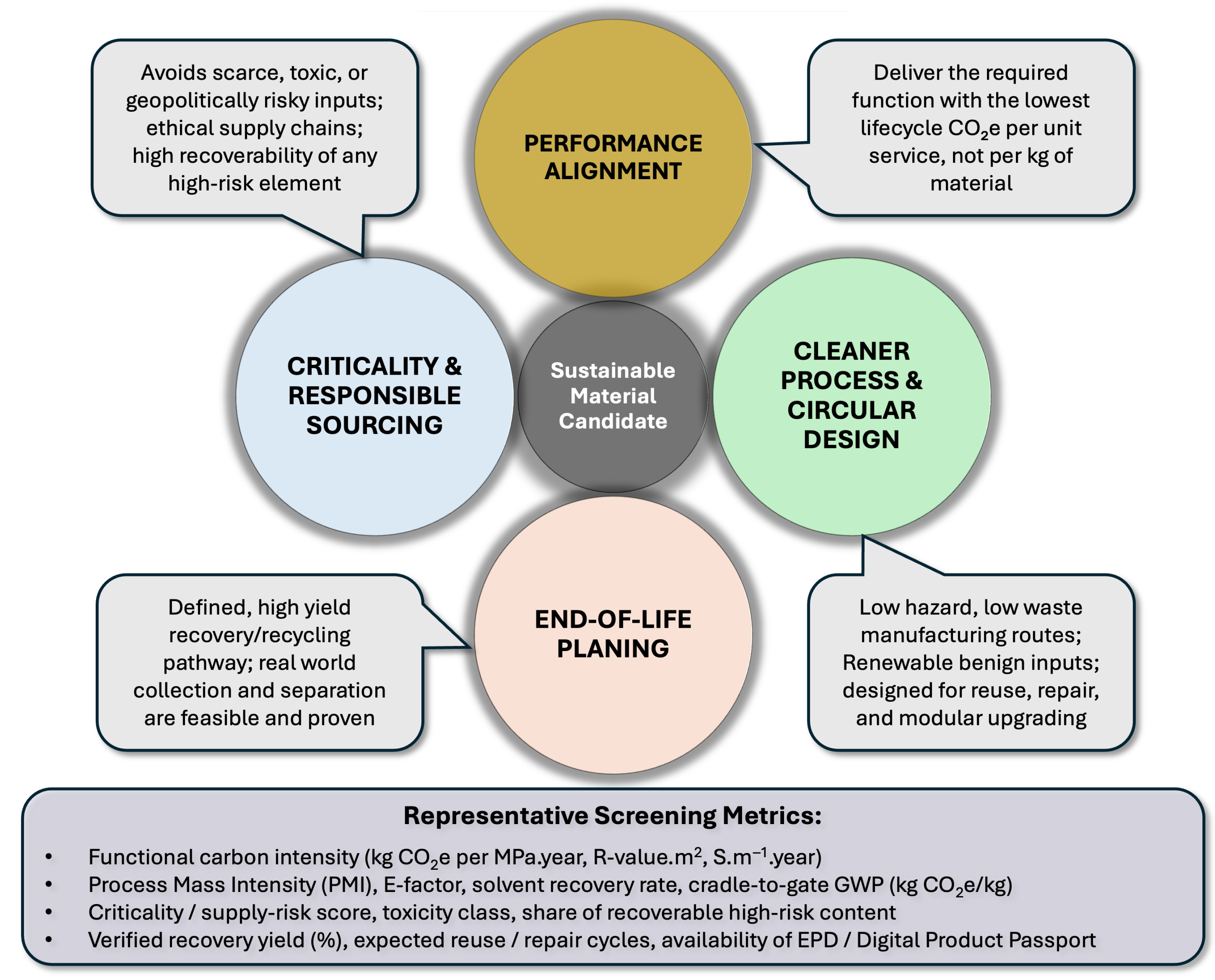 - Design Principles: We present four foundational principles for sustainable material design performance alignment, green chemistry and circularity, criticality and responsible sourcing, and end-of-life recovery, as a cohesive evaluation rubric.