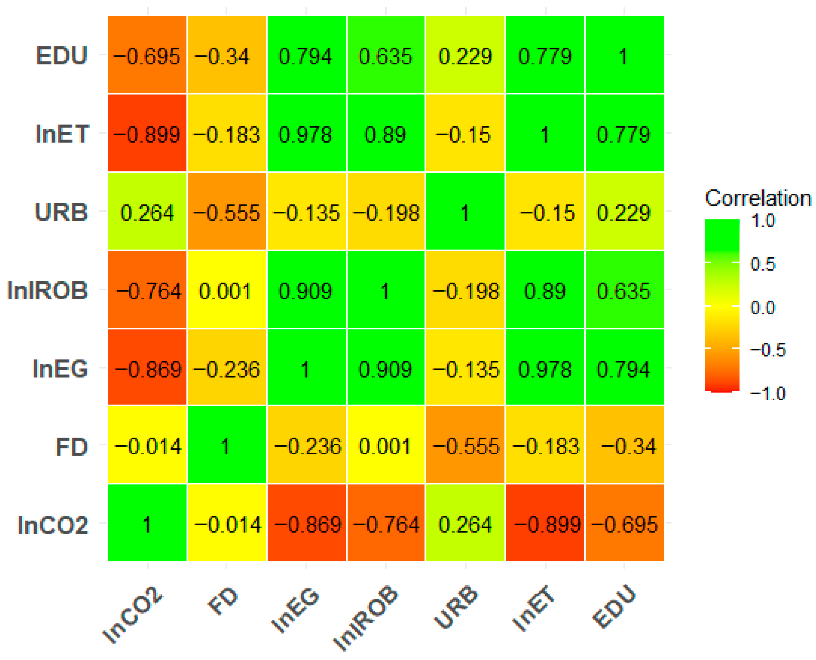 Figure 1) shows its strongest inverse correlations with the energy-transition proxy lnET (−0.899) and with lnEG (−0.869) and lnIROB (−0.764), implying that periods with greater energy transition, higher logged output, and industrial activity in this sample are associated with lower logged CO