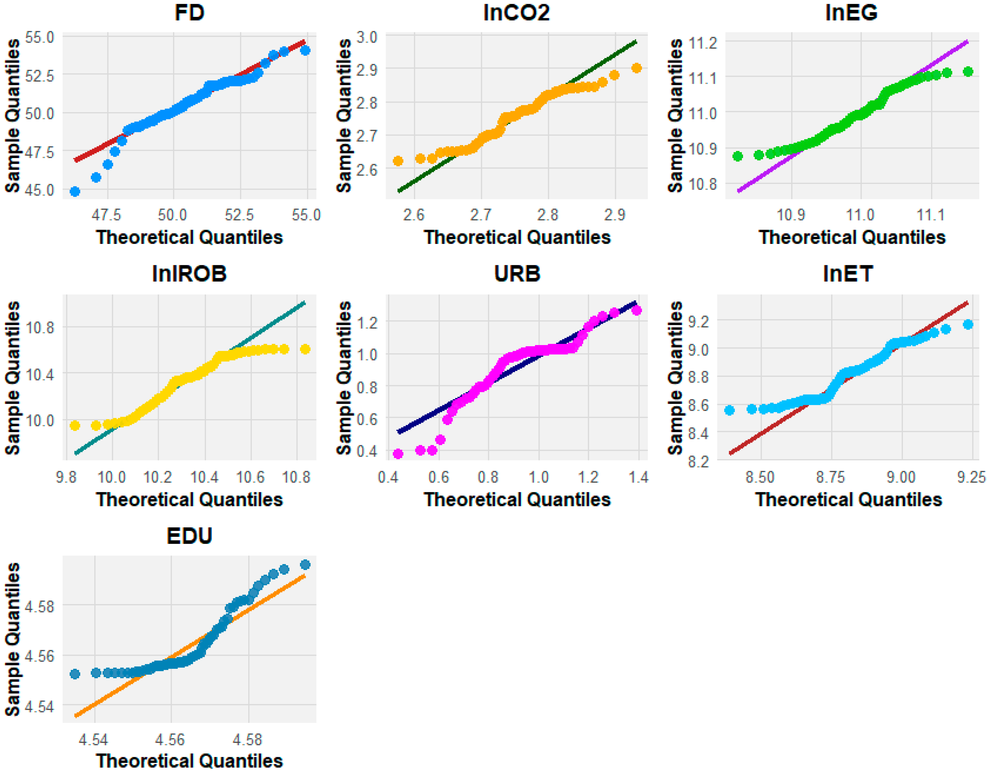 2 shows a mild S-shape, implying platykurtosis (light tails) with slight skew. lnEG is close to linear in the middle but curves upward at the upper tail, suggesting a touch of right-skew. By contrast, lnIROB lies closest to the reference line with only minor tail drift—aligning with its non-rejection of normality. URB displays the largest deviations at both tails and some curvature, corroborating strong non-normality. Finally, lnET is mostly aligned with small right-tail divergence. Overall, these plots confirm that several series are not Gaussian—especially in the tails—supporting the use of robust, distribution-sensitive methods (e.g., quantile models) in subsequent analysis.