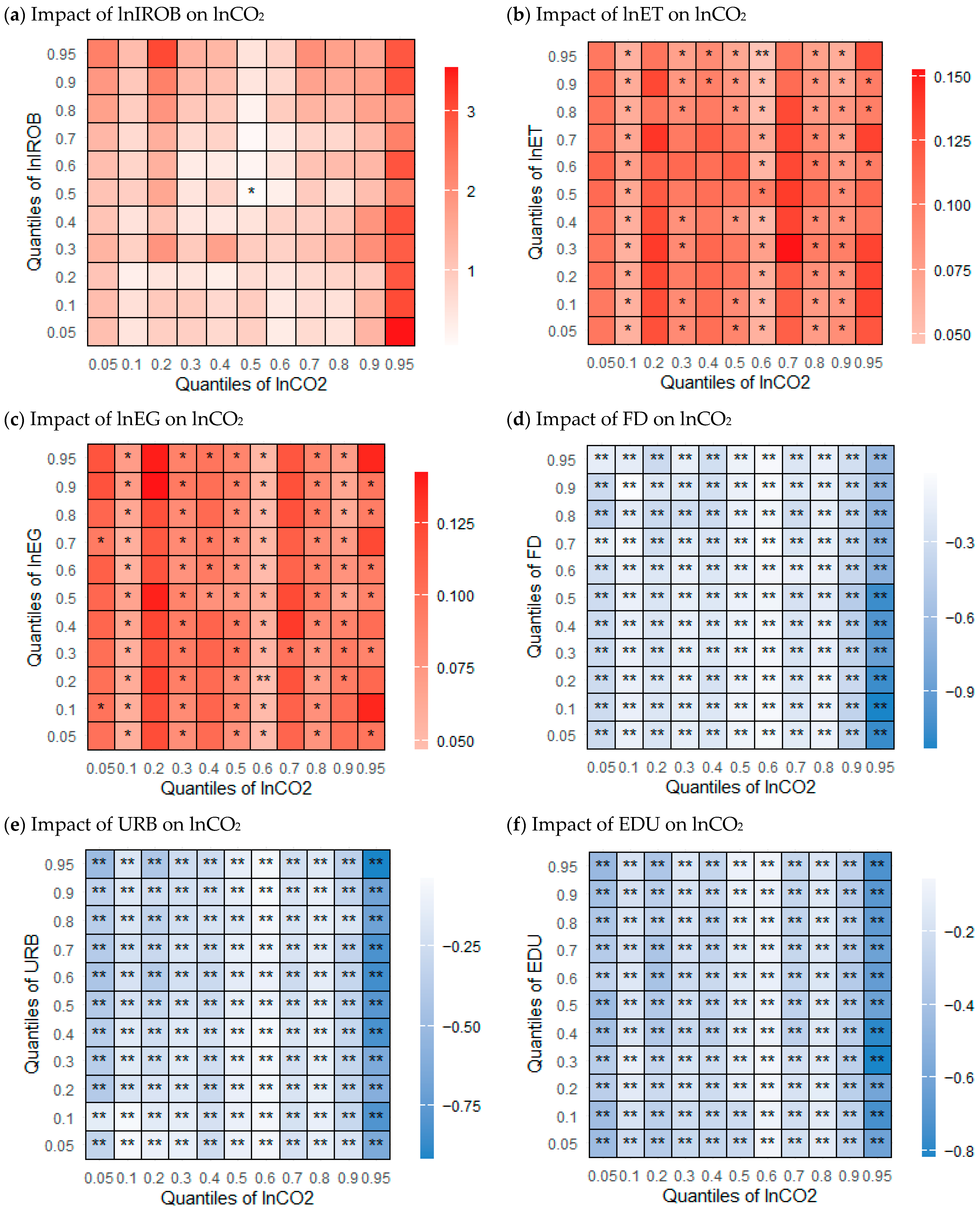 Furthermore, URB and CO2 (Panel e) association flips the sign. When URB sits in its upper quantiles (≥0.60) and CO2 is low to mid (0.05–0.30), and again at very high CO2 (0.90–0.95). Urban population growth therefore raises emissions in most states—consistent with higher transport demand, construction, and electricity use—unless paired with compact city design, mass transit, and clean grids. The effect weakens toward the mid-range of both distributions, but the persistent positives at the upper URB quantiles highlight that, without urban-form and energy-mix reforms, densification is emissions-intensive. Lastly, the CO2 and EDU (see Panel f) show strong and significant negative effects, suggesting that increases in education reduce emissions more effectively when both variables are at low-to-mid levels.
