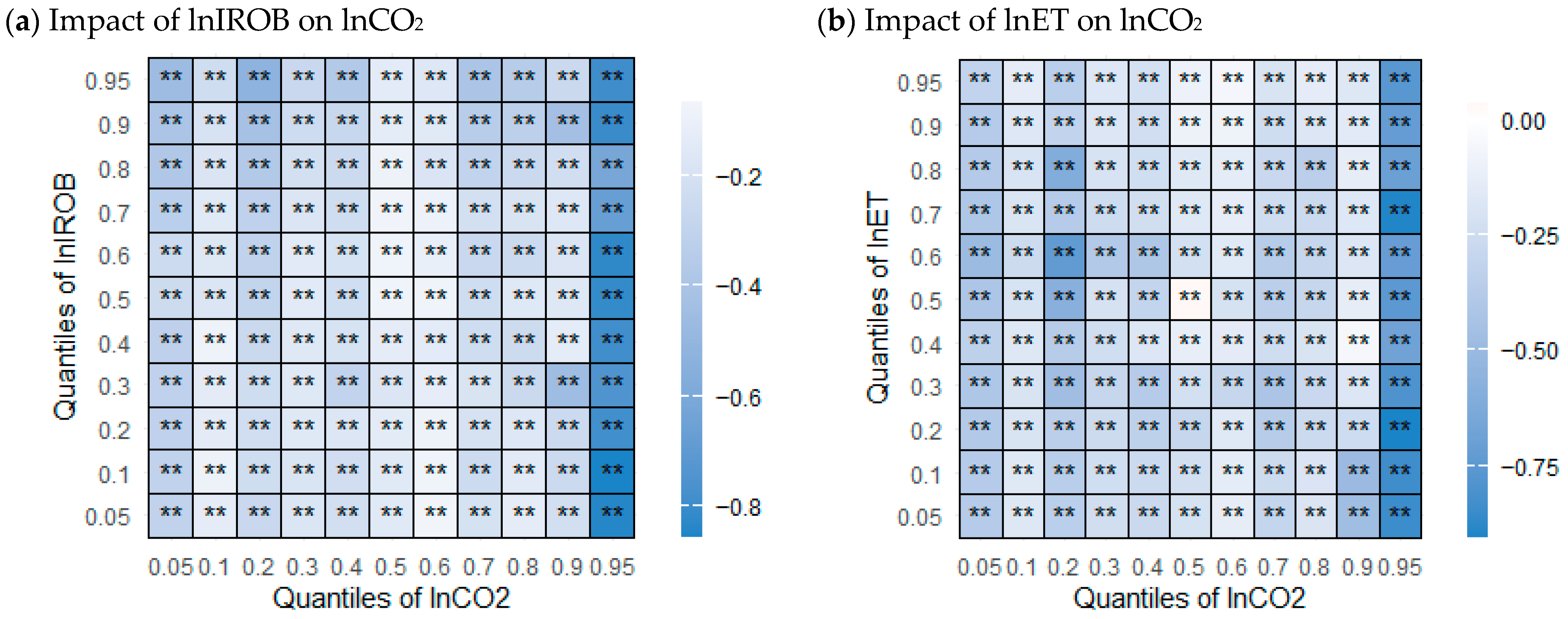 2 is in the upper tail (0.90–0.95) for a wide range of IROB quantiles. Around the middle quantiles of both variables the effects thin out, suggesting a plateau where efficiency gains and scale effects offset each other. Interpreted economically, diffusion of industrial robots appears to cut emissions—likely via precision, energy efficiency, and process optimization—especially during low-emission or high-stress (high-emission) regimes. The impact of ET of CO
