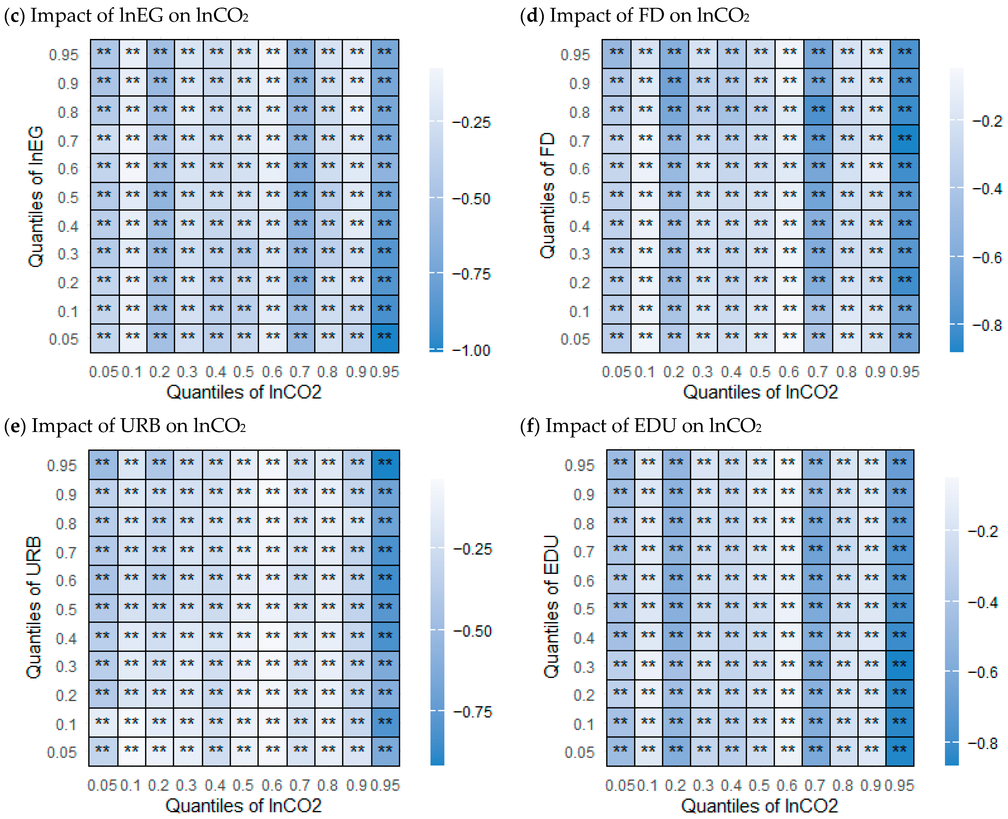 FD (see Panel d) exhibits uniformly negative short-run effects and the magnitudes are comparatively larger (scale to roughly −0.9). This implies that when finance deepens, near-term CO2 falls, plausibly because credit access accelerates efficiency retrofits, renewable connections, and cleaner capital purchases right away. URB (see Panel e) is also negative across all quantiles here—an uncommon but interpretable short-run result: in contexts where urban growth coincides with densification, transit expansion, and electrification of end-uses, the immediate effect can be CO2-reducing (less per capita travel, shorter supply chains). Regarding Panel f, the result shows a consistently strong and significant negative relationship between EDU and CO2 across all quantile combinations. The results show that from the lowest to the highest quantiles, improvements in education are robustly associated with reductions in CO2 regardless of the distributional levels of either variable. This suggests that education serves as a powerful and stable driver of environmental quality, with its mitigating effect on emissions being both persistent and statistically significant across the entire spectrum.