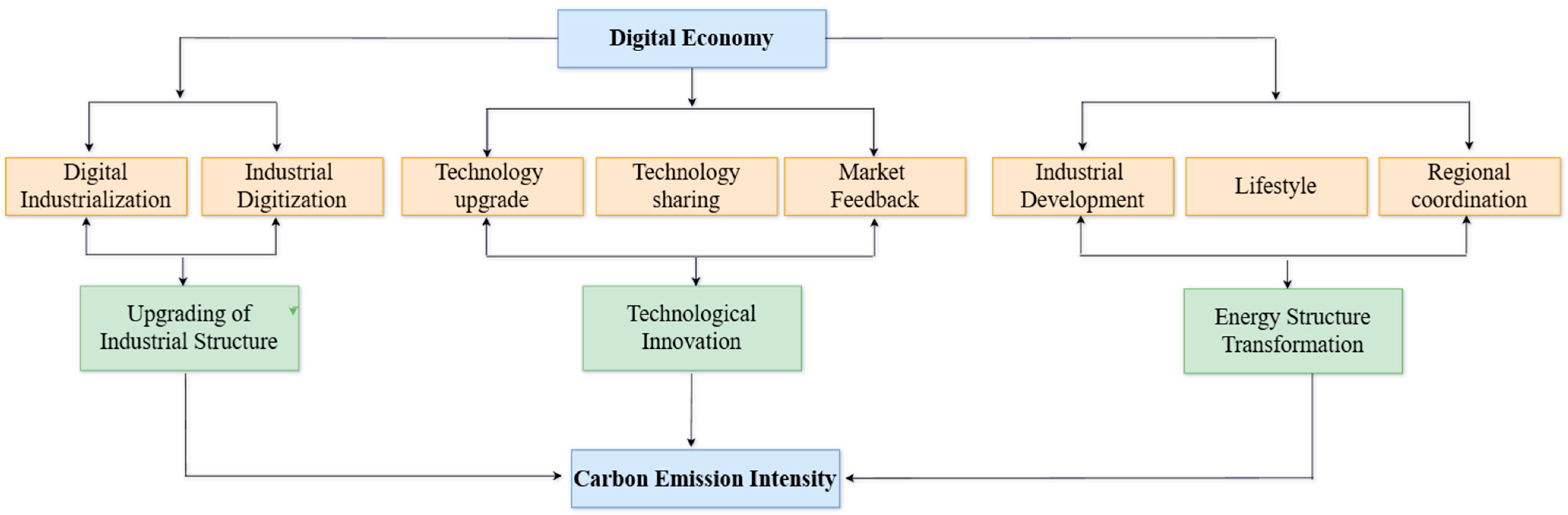 In terms of its impact mechanism can be summarized as follows: it first catalyzes the emergence of low-energy-consumption industries (industrial structure upgrading), directly replacing high-carbon activities and optimizing factor allocation. Subsequently, the operation and competition of new business models inherently drive innovation in green technologies and processes (technological innovation). Ultimately, the simultaneous leap in industrial structure and technological sophistication lays a solid foundation for the clean and efficient transformation of the energy system (improved energy structure). These three elements are interlinked, collectively forming the core mechanism driving carbon emission reductions. The mechanism through which the digital economy impacts carbon emissions is illustrated in