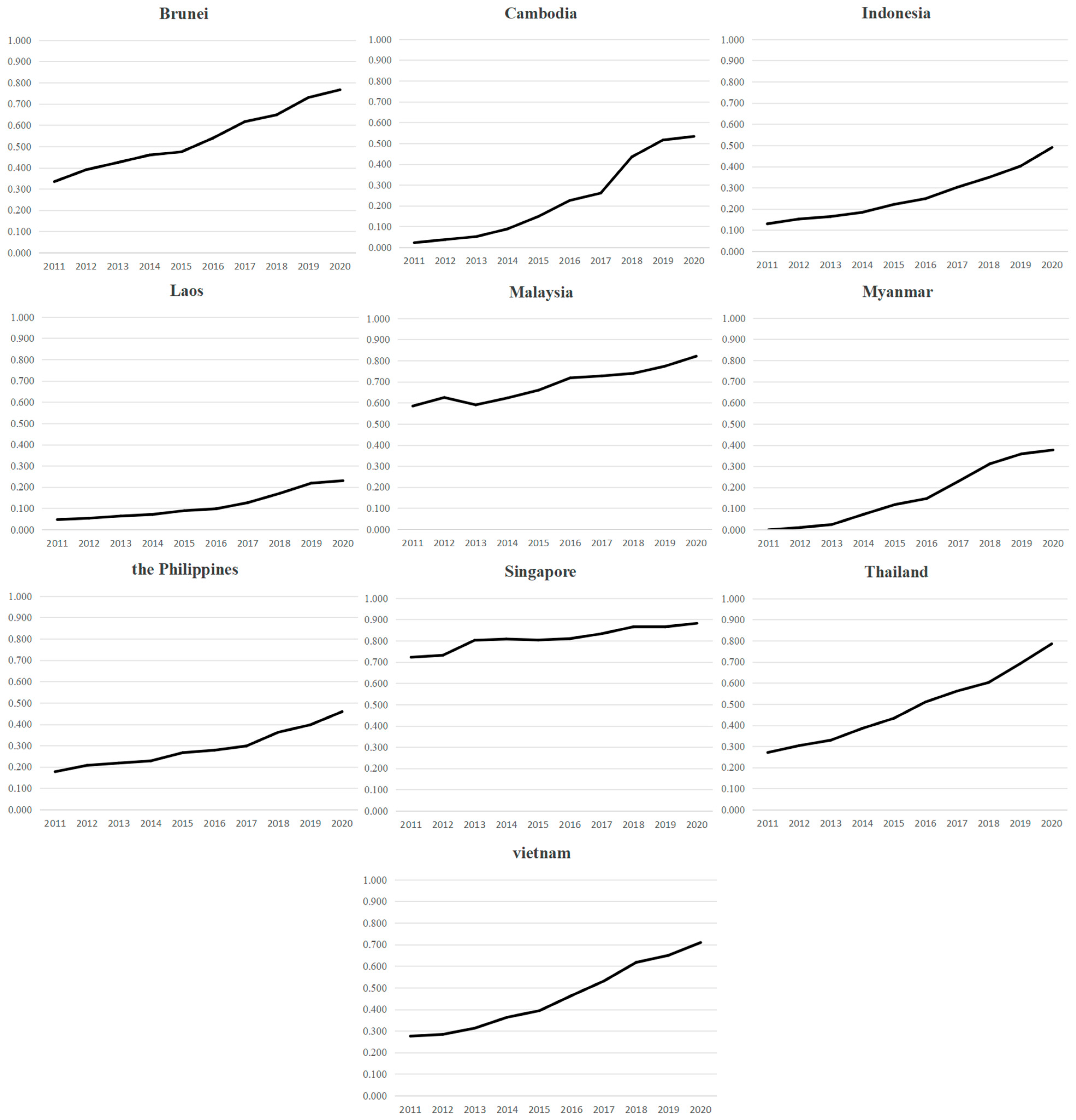 Table 1). Furthermore, regional strategies advocate for a comprehensive energy transition, emphasizing the scaled utilization of renewables and the accelerated electrification of urban transport networks. These initiatives inherently rely on support from digital and intelligent technological platforms. The adoption of such technologies can catalyze the overhaul of conventional industrial production paradigms. ASEAN’s environmental transition gains accelerated momentum from the rapid spread of digital economic activities.