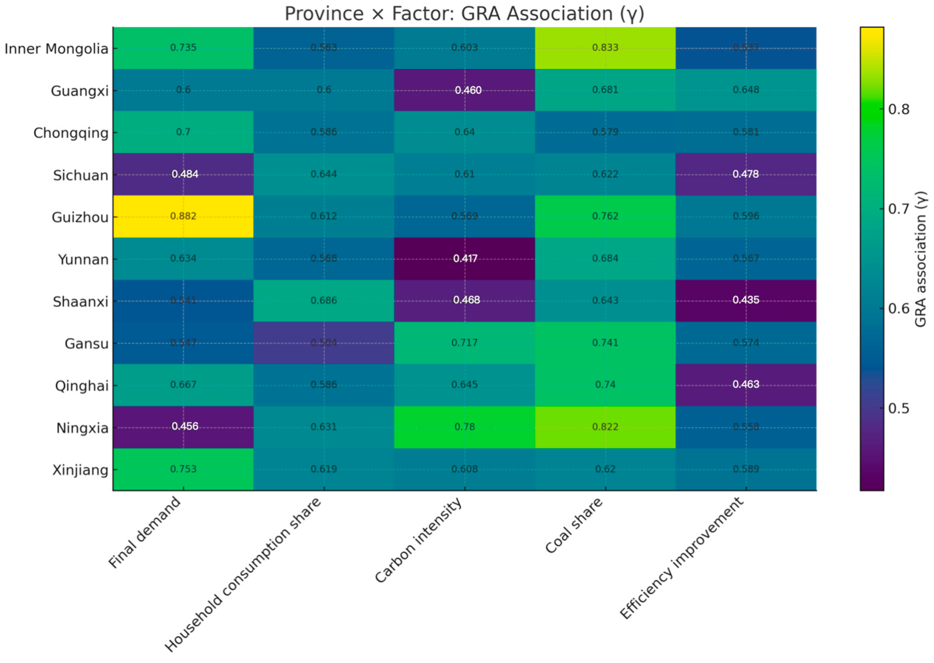 Linking these patterns to our industry-level grey relational analysis (GRA), two mechanisms dominate: (i) energy factors—notably energy intensity and the electricity/coal mix—together with output scale, which exhibit the strongest correlations with sectoral footprints and are consistent with overshoots in provinces hosting basic-materials and equipment chains; and (ii) technology factors (process efficiency, equipment vintages), which are negatively associated with emissions, implying that diffusion of best-available technologies can materially bend the curve. Guided by these mechanisms and consistent with the spatial–economic drivers identified by the QAP analysis, we propose a targeted package: close the energy-mix gap by accelerating renewable build-out and interprovincial green-power trade—prioritizing long-term PPAs for advanced-manufacturing parks in non-compliant provinces (especially Qinghai, Chongqing, Guizhou); pursue deep retrofits in energy-intensive subsectors (cement/clinker, glass, non-metallic minerals, heavy equipment) via waste-heat recovery, high-efficiency drives, low-clinker cements, process electrification, and selective CCUS at high-purity sources; accelerate technology diffusion through province-to-province retrofit funds and vendor-assisted performance contracts directed to Chongqing, Guizhou, Guangxi, complemented by digital energy-management systems; implement supply chain governance along contiguous corridors (harmonized energy/heat-reuse standards and coordinated “brown-to-green” supplier upgrading) to curb cross-border rebound; and embed open-economy safeguards (green procurement, low-carbon product standards, supplier disclosure) so that trade transmits low-carbon practices rather than carbon leakage. For Inner Mongolia, Sichuan, Shaanxi, Gansu, Ningxia, which already meet indicative targets, maintain momentum through performance-based energy quotas, best-in-class process benchmarks, and continuous green-power contracting. Collectively, aligning provincial action with the GRA-identified energy and technology levers—while acting on spatial and development gradients highlighted by QAP—offers a credible pathway to convert today’s mixed compliance into region-wide attainment of the 2030 goal.
