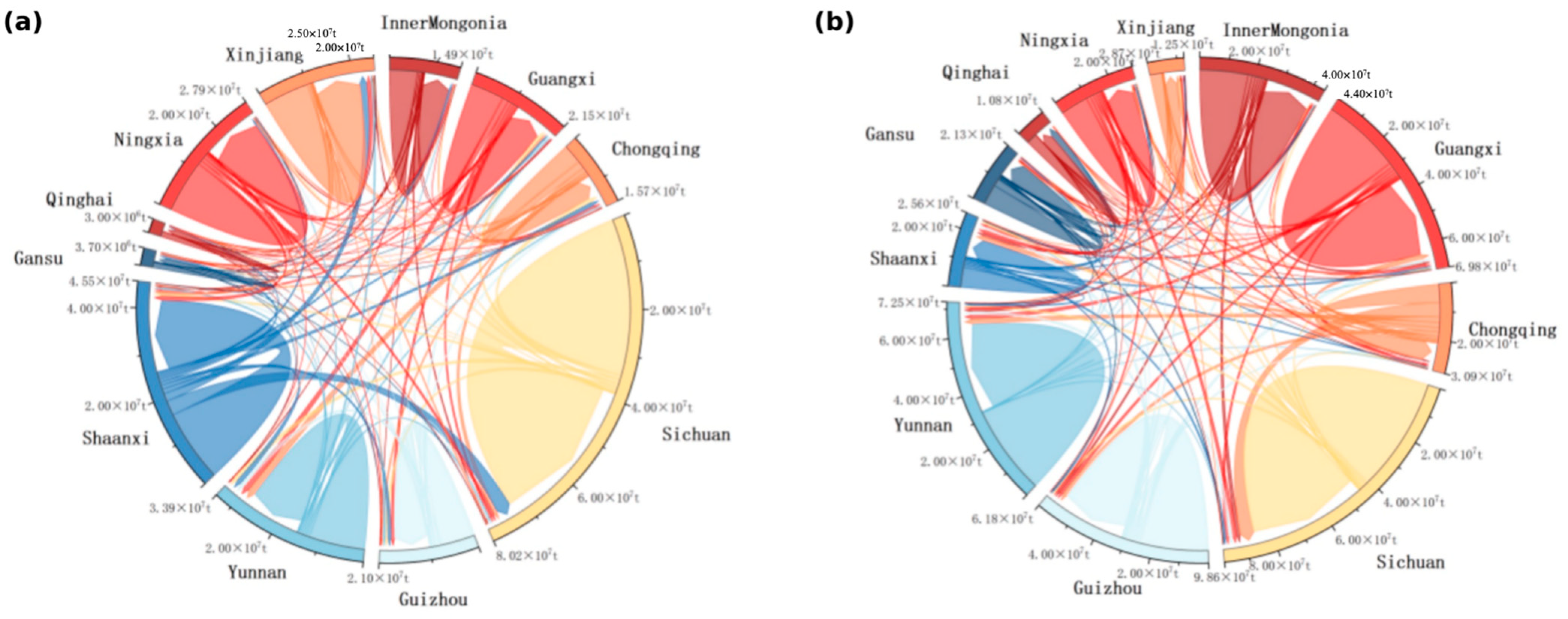 In 2030, the interprovincial embodied carbon transfer of advanced manufacturing in Western China is characterized by concentrated scale, a pronounced core–periphery structure, and active bidirectional flows. Overall, Sichuan, Yunnan, Guangxi, Guizhou, and Chongqing are the provinces with the largest volumes of embodied carbon transfers. Notably, Sichuan and Yunnan exhibit particularly large internal embodied carbon flows (i.e., intra-provincial transfers), reaching 61.976 million tons and 47.942 million tons, respectively, indicating that carbon emissions and manufacturing output are highly concentrated within these provinces. At the same time, Guangxi, Guizhou, and Ningxia demonstrate strong capabilities in embodied carbon outflows, transferring substantial carbon emissions to neighbouring provinces such as Chongqing and Sichuan. Several key factors contribute to this spatial pattern: first, Sichuan, Yunnan, and Guangxi have large-scale advanced manufacturing industries with long industrial chains and strong local consumption and processing demands, leading to both high internal and outward embodied carbon transfers; second, Guizhou and Ningxia, as providers of energy and raw materials, exhibit export-oriented characteristics with industrial structures dominated by energy-intensive and high-emission sectors; third, industrial linkages among western provinces have strengthened, resulting in the formation of a carbon transfer network centred around core provinces and supported by surrounding regions. Overall, the regional industrial division of labour and energy consumption structure determine the spatial distribution characteristics of embodied carbon transfer across Western China’s advanced manufacturing sector (