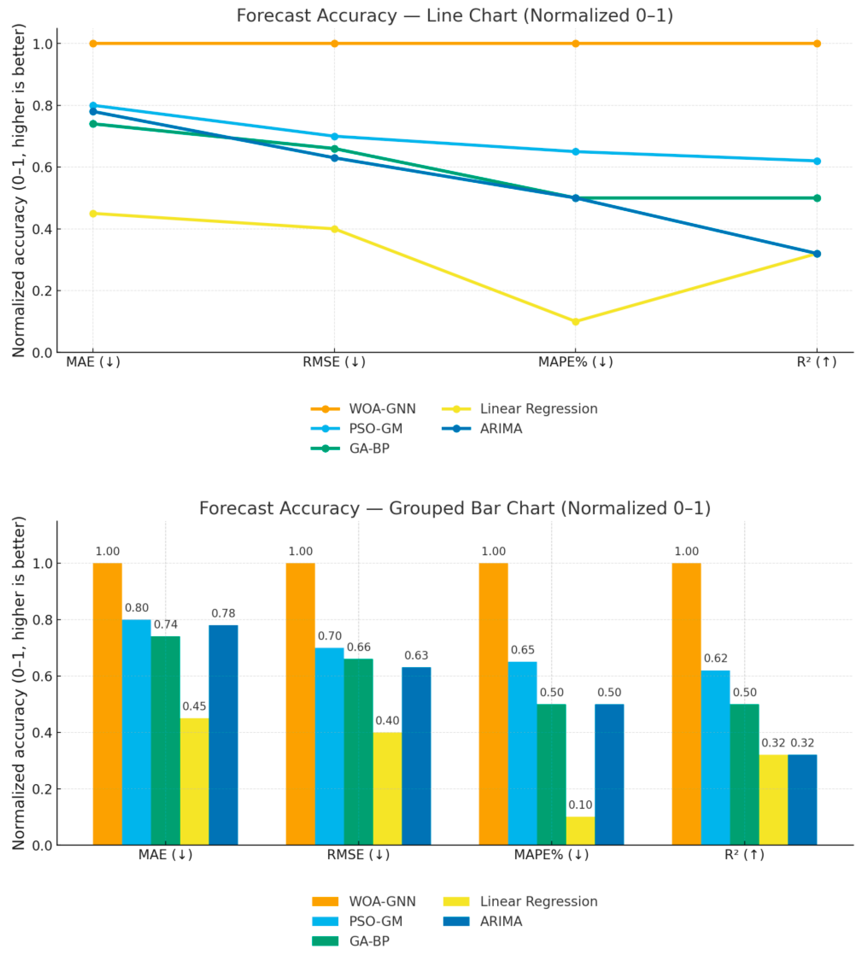 2 are strictly out-of-sample and averaged across the five repeats (means ± s.d. where noted). Under identical splits, preprocessing, and tuning budgets, the proposed WOA–GNN consistently achieves the lowest mean MAE/MSE and the highest mean R