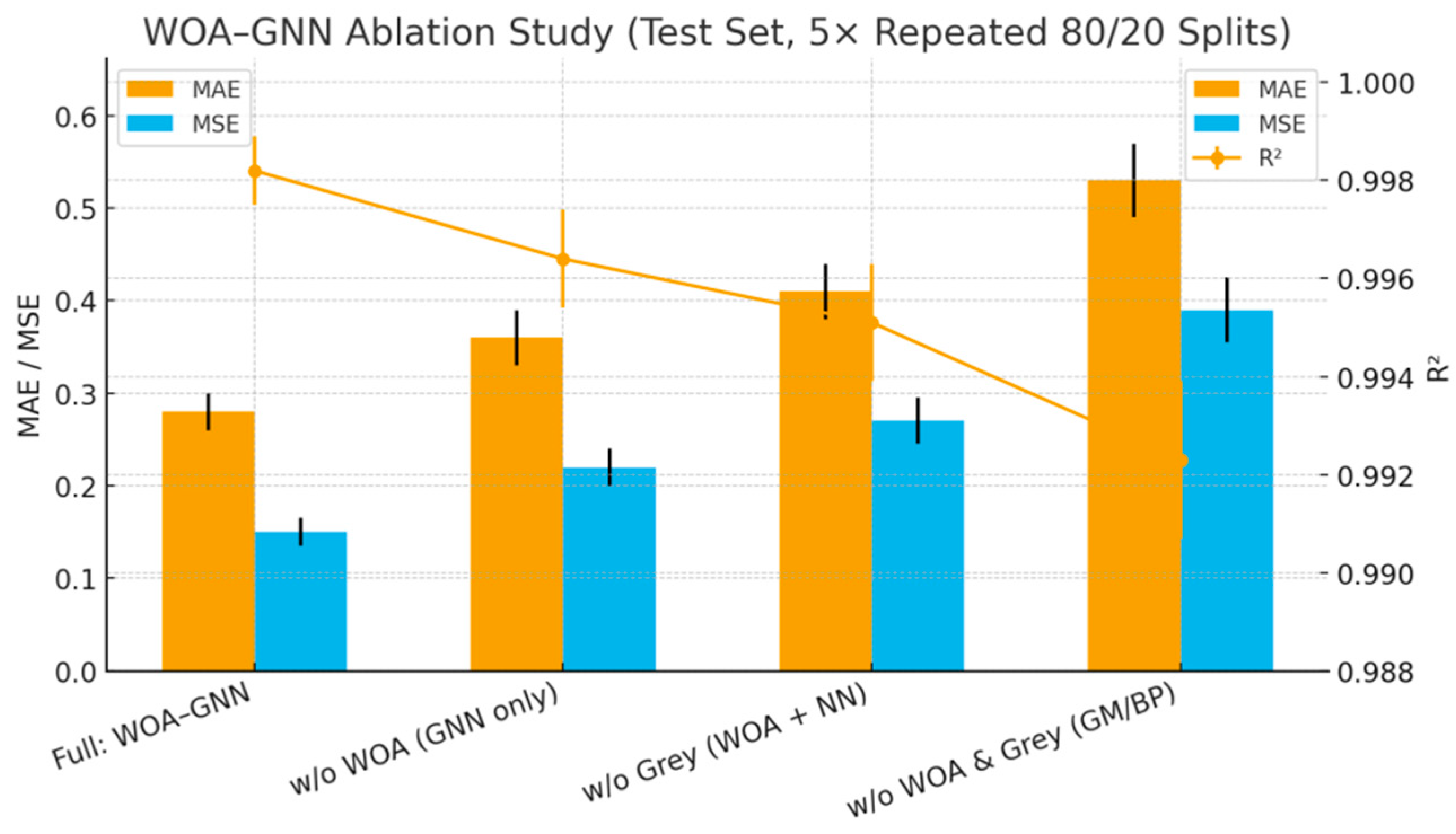 Figure 9) further shows that removing Whale Optimization (plain GNN), removing the grey mechanism (WOA-tuned standard NN), or removing both degrades accuracy—raising MAE/MSE and lowering R