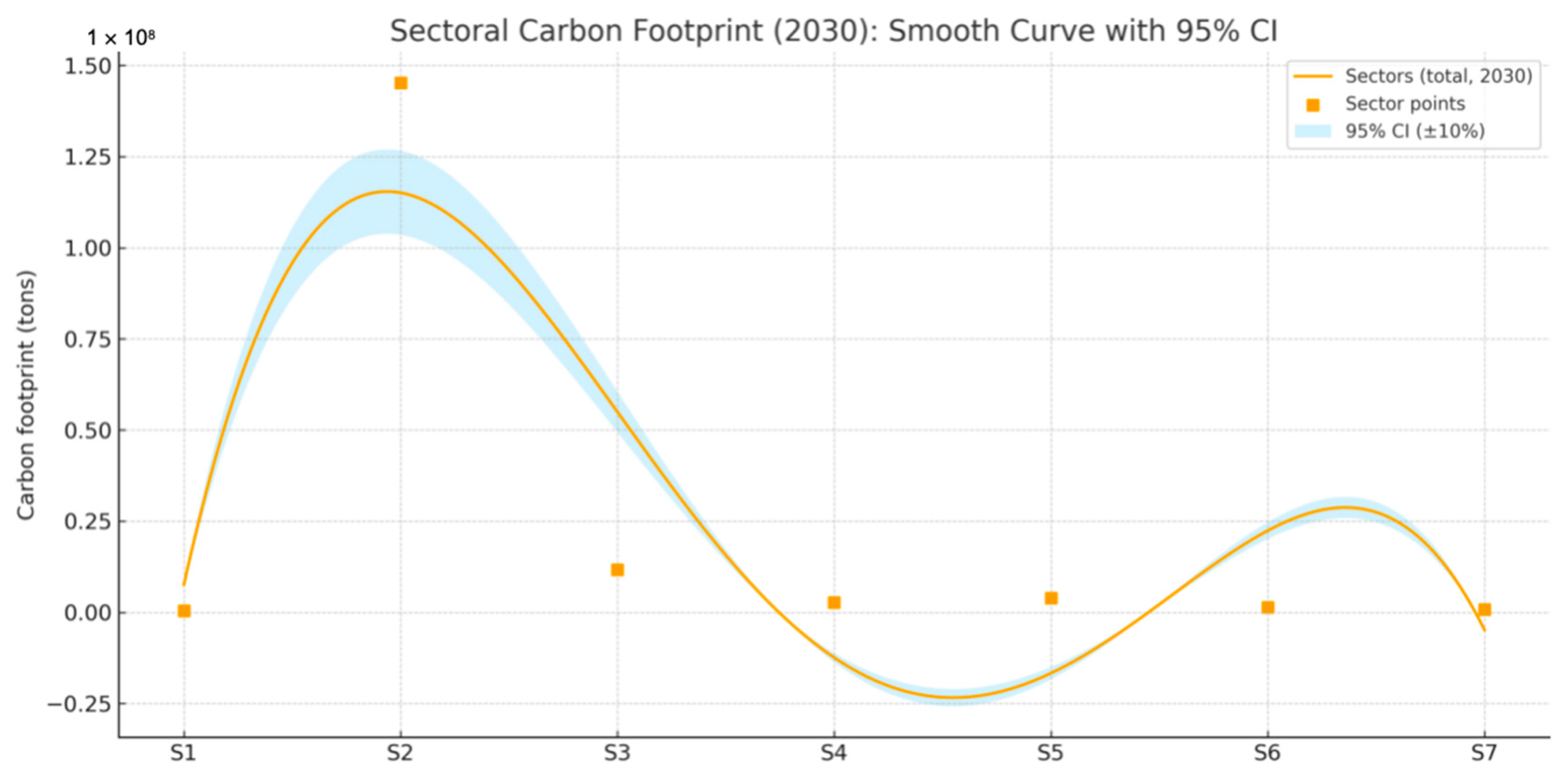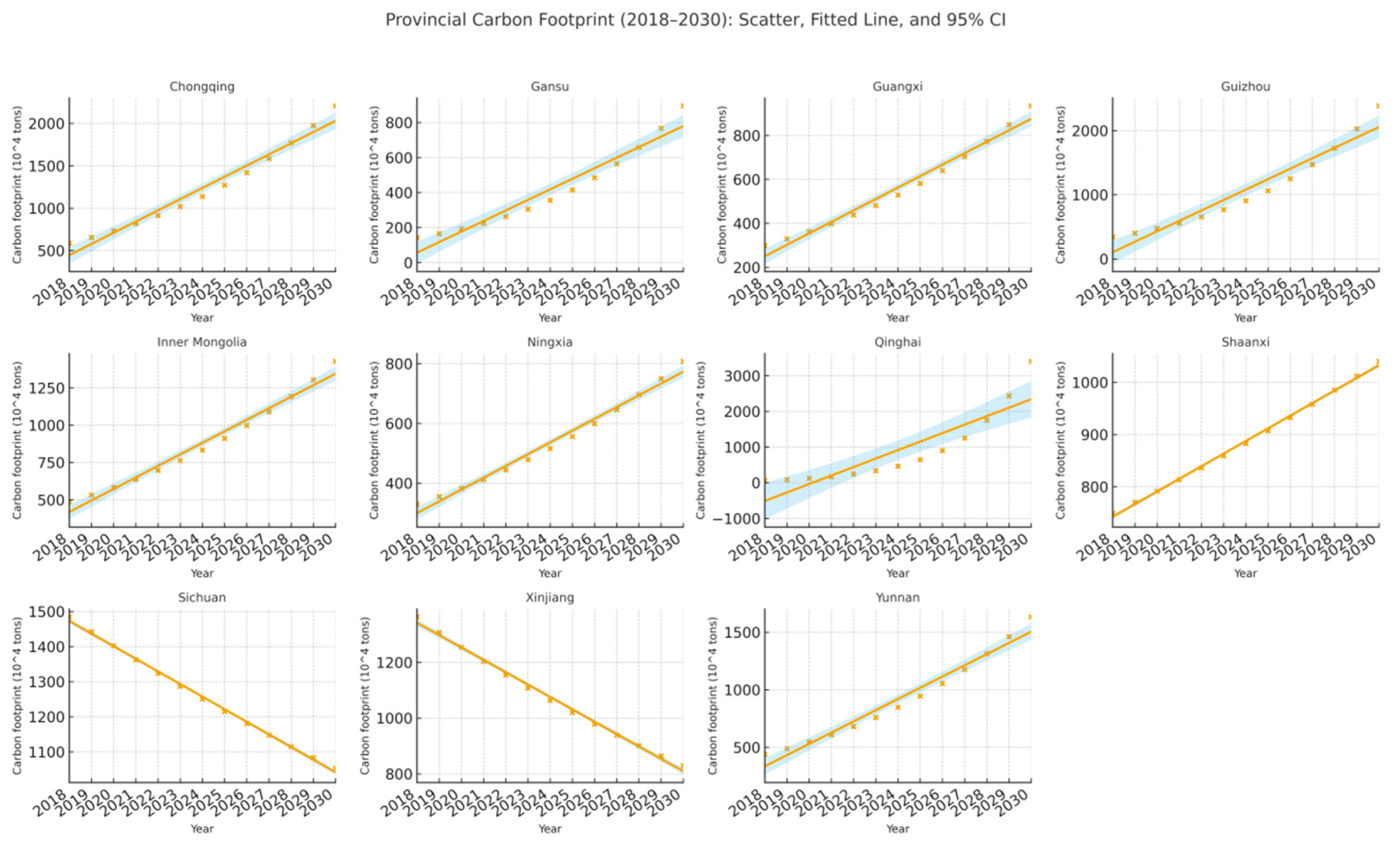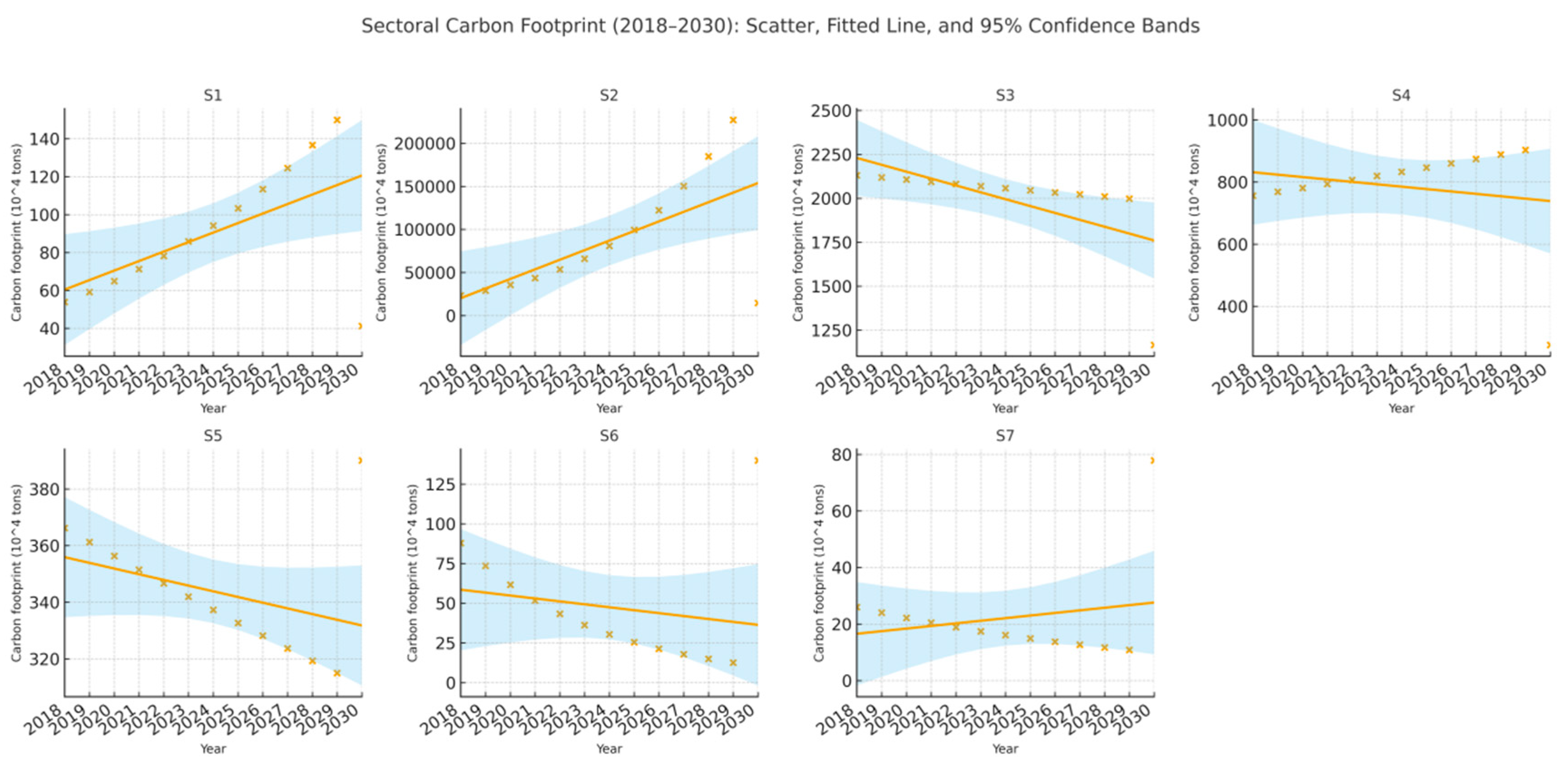 Figure 12 at the sectoral level (S1–S7). The fitted line captures the direction and pace of change, while the confidence envelope quantifies statistical uncertainty around each mean trajectory. By displaying continuous multi-year trend modes, these panels offer a clearer, more comprehensive view of how provincial and sectoral footprints are expected to evolve over time, thereby strengthening the interpretation of temporal dynamics and cross-sectional heterogeneity.
