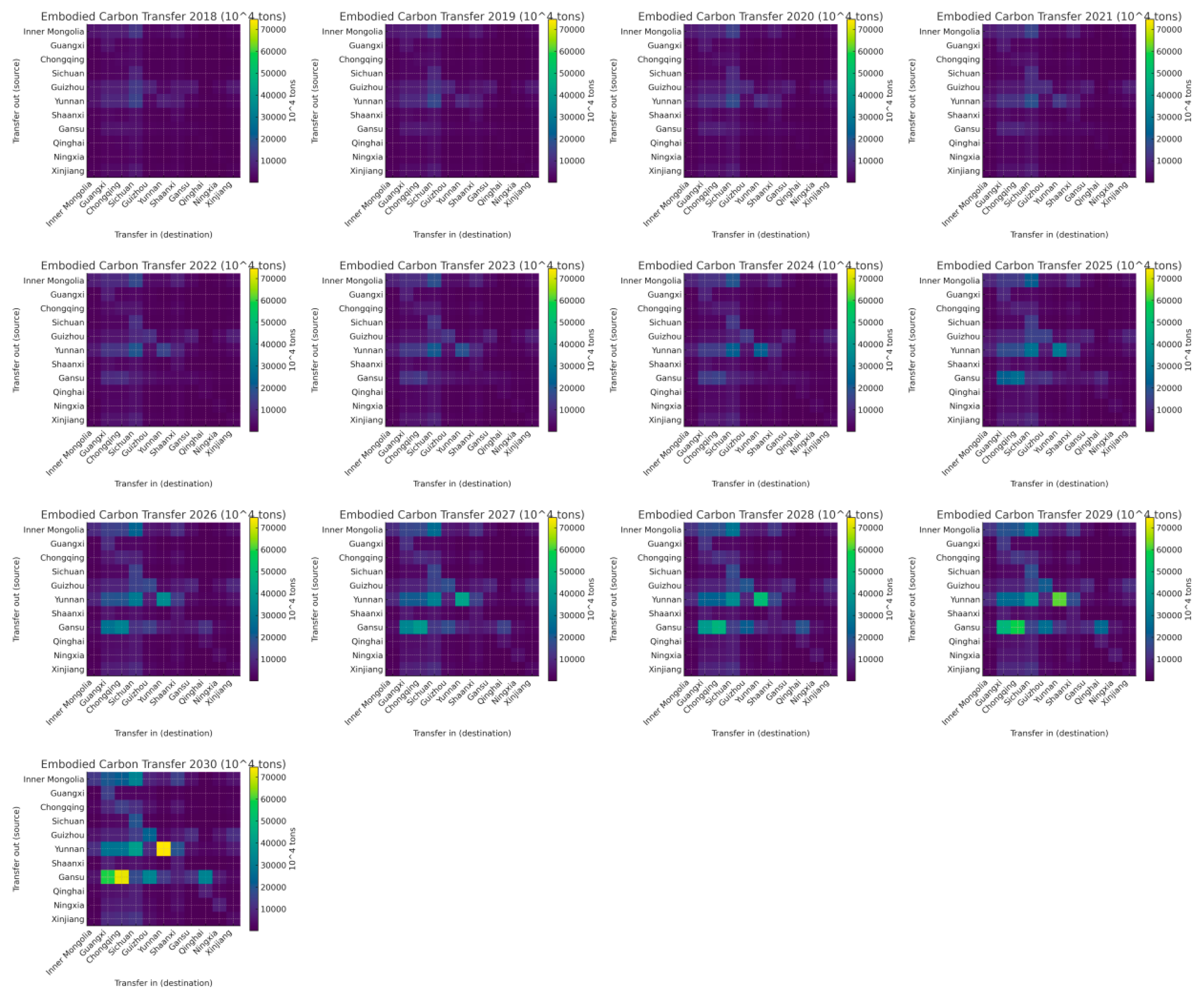 Here we visualize the structural evolution of embodied carbon transfers in Western China’s advanced manufacturing from 2018 to 2030 using annual heatmaps at two resolutions: an 11 × 11 provincial matrix and a 7 × 7 sectoral matrix (units: 10