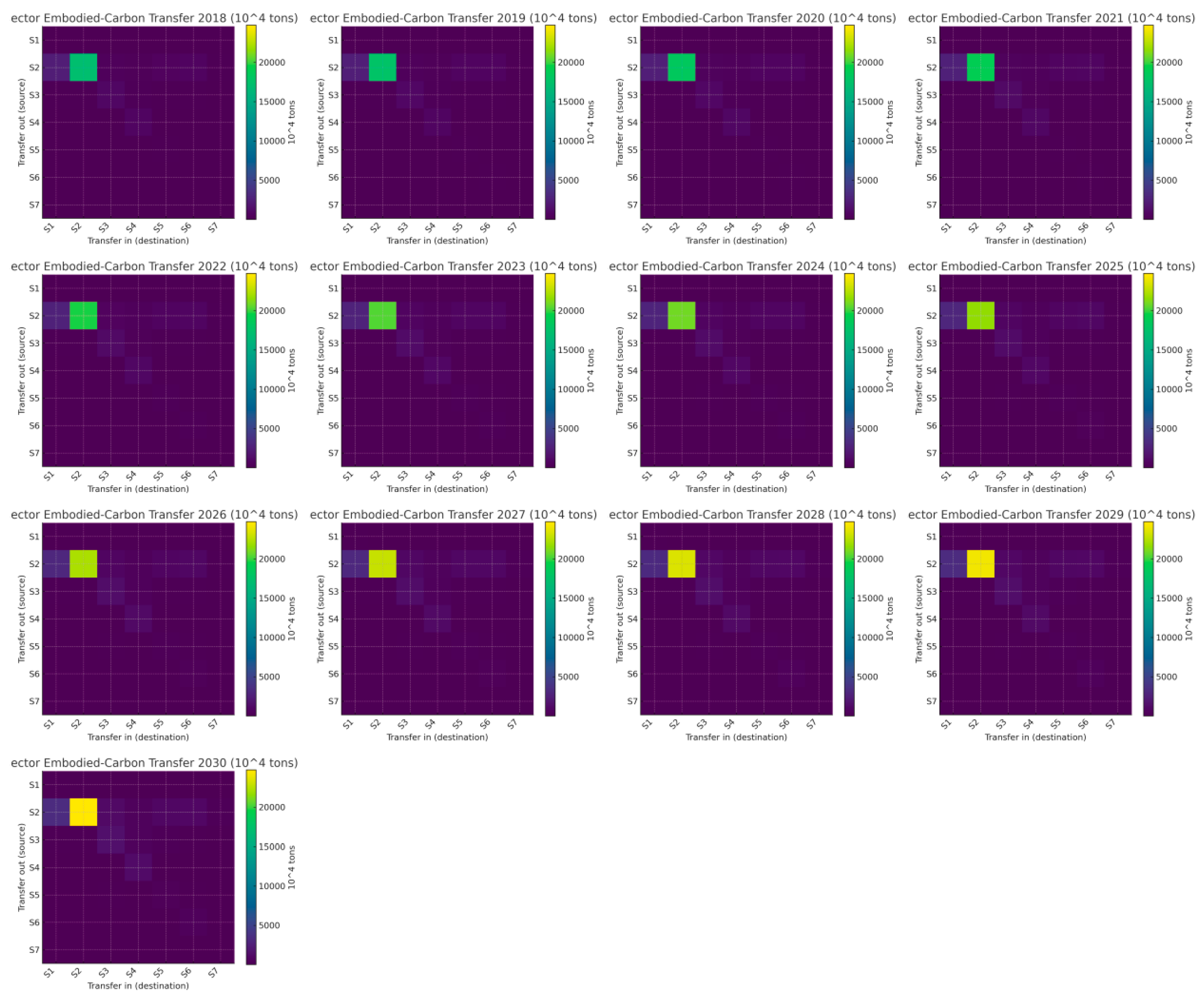Figure 14, two patterns are salient. At the provincial level, embodied carbon transfers intensify and become more hub-and-corridor oriented: large self-flows (diagonal cells) expand steadily in Sichuan, Chongqing, Guangxi, Qinghai, Ningxia, and Xinjiang, indicating deeper intra-provincial supply chain coupling, while major outbound corridors from Inner Mongolia, Yunnan, and Gansu to downstream manufacturing centres (Sichuan, Chongqing, Guangxi) thicken year by year; bidirectional links along contiguous routes (e.g., Yunnan↔Sichuan, Chongqing↔Sichuan, Inner Mongolia↔Sichuan/Chongqing) also strengthen, revealing spatial path-dependence and agglomeration in shared industrial belts. At the sector level, the network is increasingly diagonal-dominant and S2-centred: the S2→S2 block leads the matrix throughout, cross-sector flows such as S3→S4 and S5→S3/S4 enlarge, and the sharp rise in S6→S6 signals intensifying within-sector transactions (parts/modules, intermediate electrified processes). Together, these shifts point to scale effects in energy-intensive chains (driving strong S2 links), technology upgrading and modularization (amplifying S6 and S3↔S4 exchanges), and proximity-based logistics advantages (reinforcing provincial corridors), producing a denser, more centralized embodied carbon transfer network by 2030.
