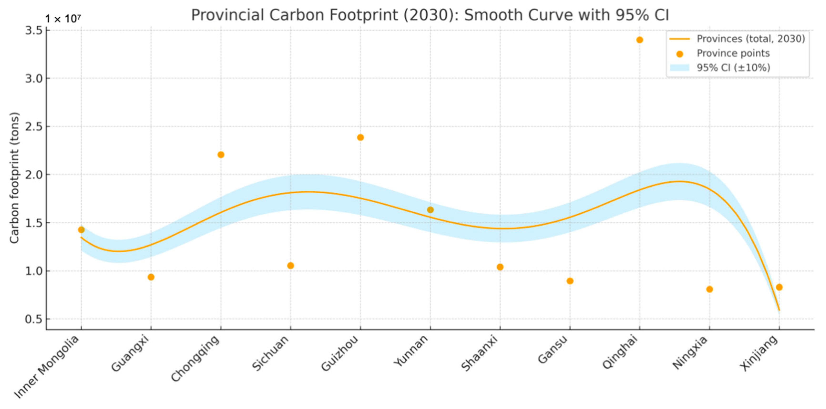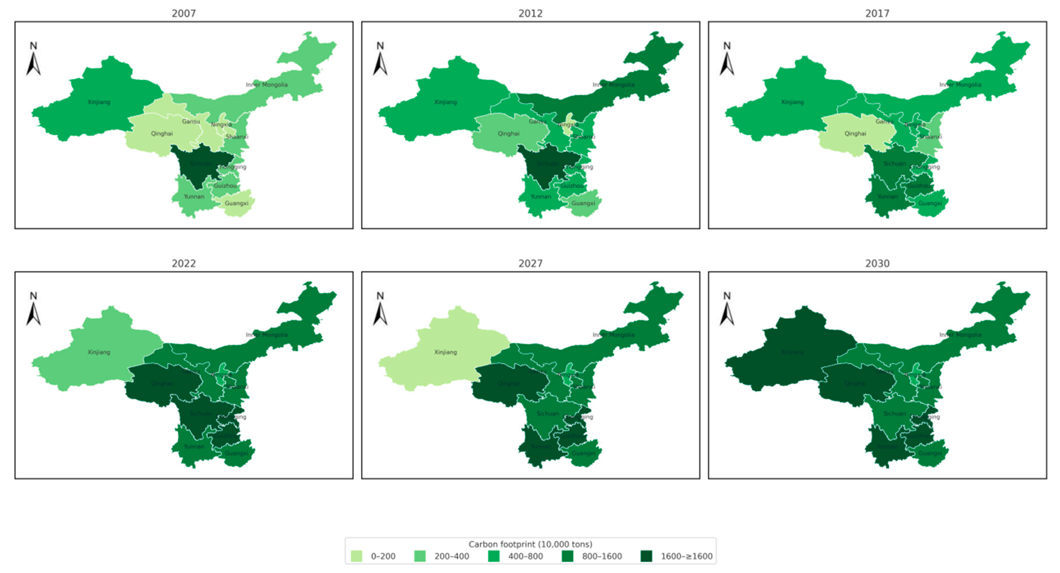 The spatial evolution of the carbon footprint from 2017 to 2030 illustrates that, with economic development and structural adjustments in manufacturing, regional disparities in carbon emissions are expected to narrow. Although Inner Mongolia, Sichuan, and Guizhou are projected to maintain dominant carbon footprints, the influence of new energy adoption, environmental policies, and industrial transformation may help mitigate overall emissions levels in Western China. At the same time, provinces such as Qinghai and Ningxia are likely to maintain their low-carbon advantages, showing trends toward green manufacturing and efficient energy use.