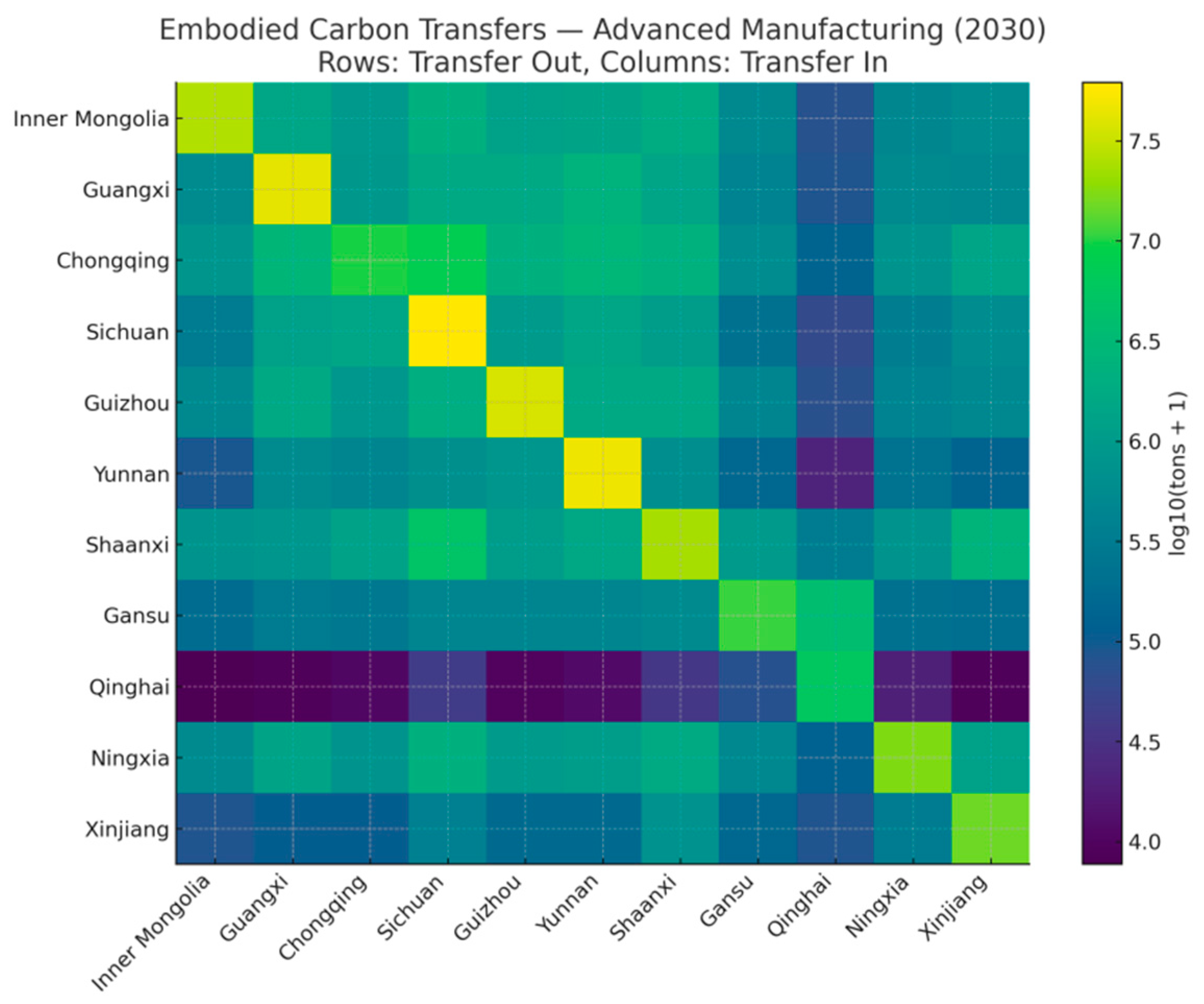 By 2030, the interprovincial embodied carbon transfer pathways of advanced manufacturing in Western China exhibit a dual pattern of “internal concentration and external diffusion,” dominated by core provinces and marked by intensive transfers between neighbouring regions. Provinces such as Sichuan, Guangxi, Guizhou, and Ningxia have developed large-scale internal self-circulating carbon transfer systems, reflecting mature manufacturing structures and strong intra-provincial industrial coupling. At the same time, Sichuan, Chongqing, Guangxi, and Guizhou act as key carbon-exporting hubs, transferring substantial embodied carbon to nearby provinces like Yunnan, Ningxia, and Gansu. Notably, Sichuan functions as both a major internal circulator and an interprovincial hub, transferring emissions to areas such as Qinghai, Xinjiang, and Ningxia. These transfer patterns reveal significant geographical proximity effects and are driven by factors such as resource endowment, regional industrial coordination, and transportation cost minimization. Meanwhile, resource-based provinces like Inner Mongolia, Gansu, and Qinghai serve as both carbon importers and suppliers of raw materials and energy, underscoring their foundational role in the regional supply chain. Overall, these dynamics are shaped by disparities in industrial structures, development stages, and geographical advantages, reflecting both deepening regional cooperation and uneven carbon burden distribution, which poses differentiated challenges for green and low-carbon transitions (