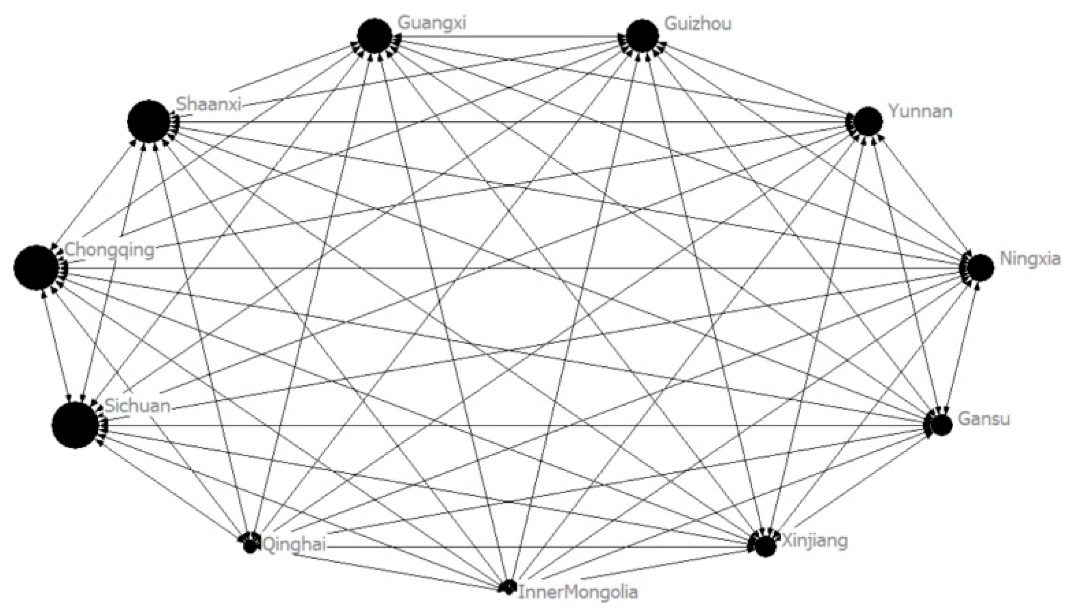 Based on the 2030 forecasting results of interprovincial and intersectoral embodied carbon transfers in the advanced manufacturing industry of Western China, directed network diagrams of embodied carbon transfer are created using UCINET 6 Version—6.780 software. In these diagrams, the direction of the arrows represents the direction of embodied carbon transfer, while the size of each network node is determined by the total amount of embodied carbon emissions transferred out from and into that node (see