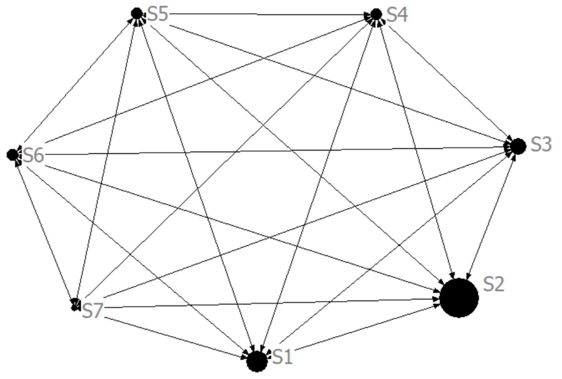 In 2030, the intersectoral embodied carbon transfer within the advanced manufacturing industry of Western China exhibits characteristics of “cumulative advantage dynamics, internal concentration, and prominent key nodes.” The non-metallic mineral products industry (S2) serves as the absolute core of carbon transfer, with a massive volume of internal transfers and significant carbon outflows to other sectors. This is followed by the general and special equipment manufacturing industry (S3) and the aerospace and other transportation equipment manufacturing industry (S4), reflecting the scale effect of the industries and the driving role of upstream and downstream linkages [