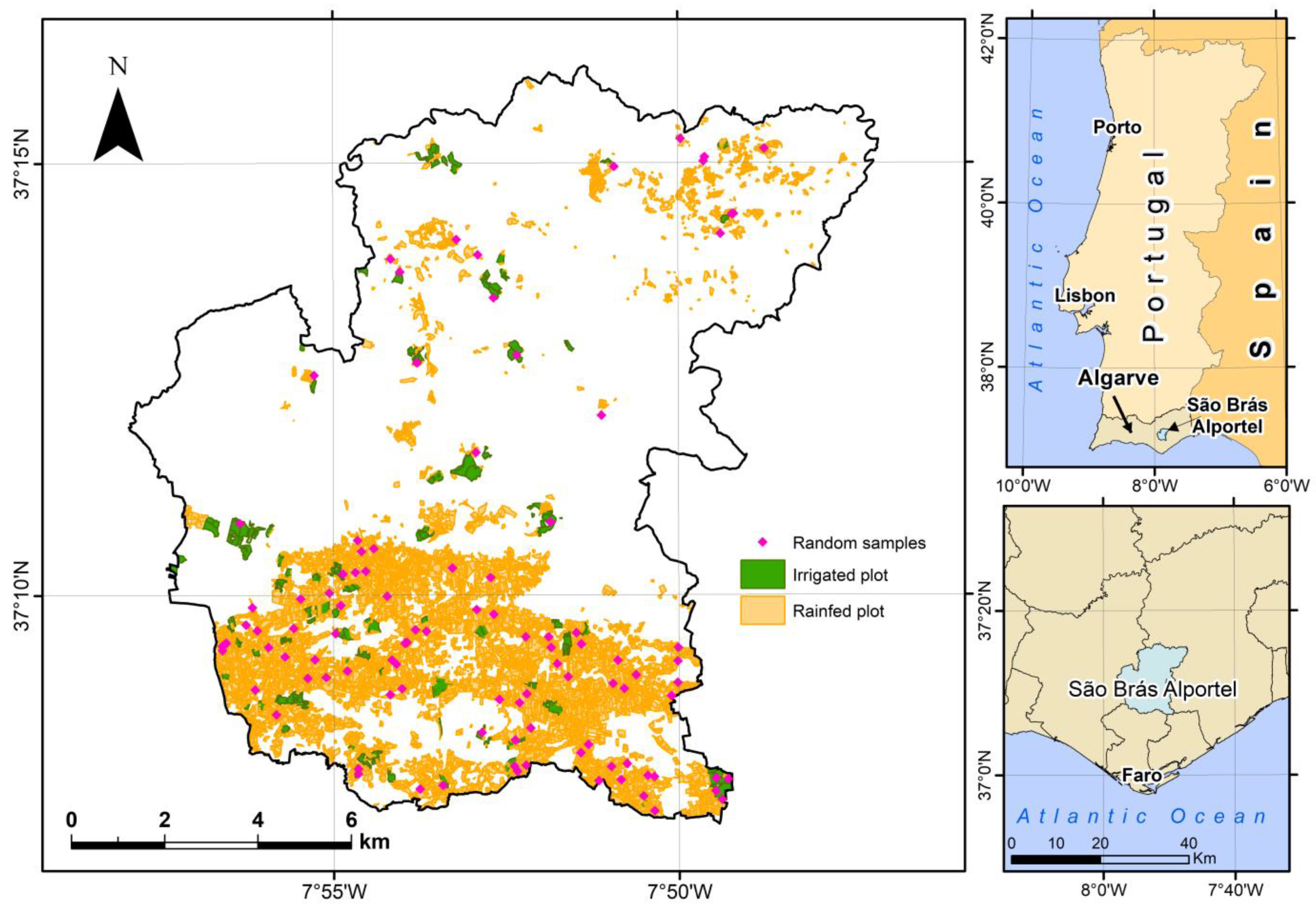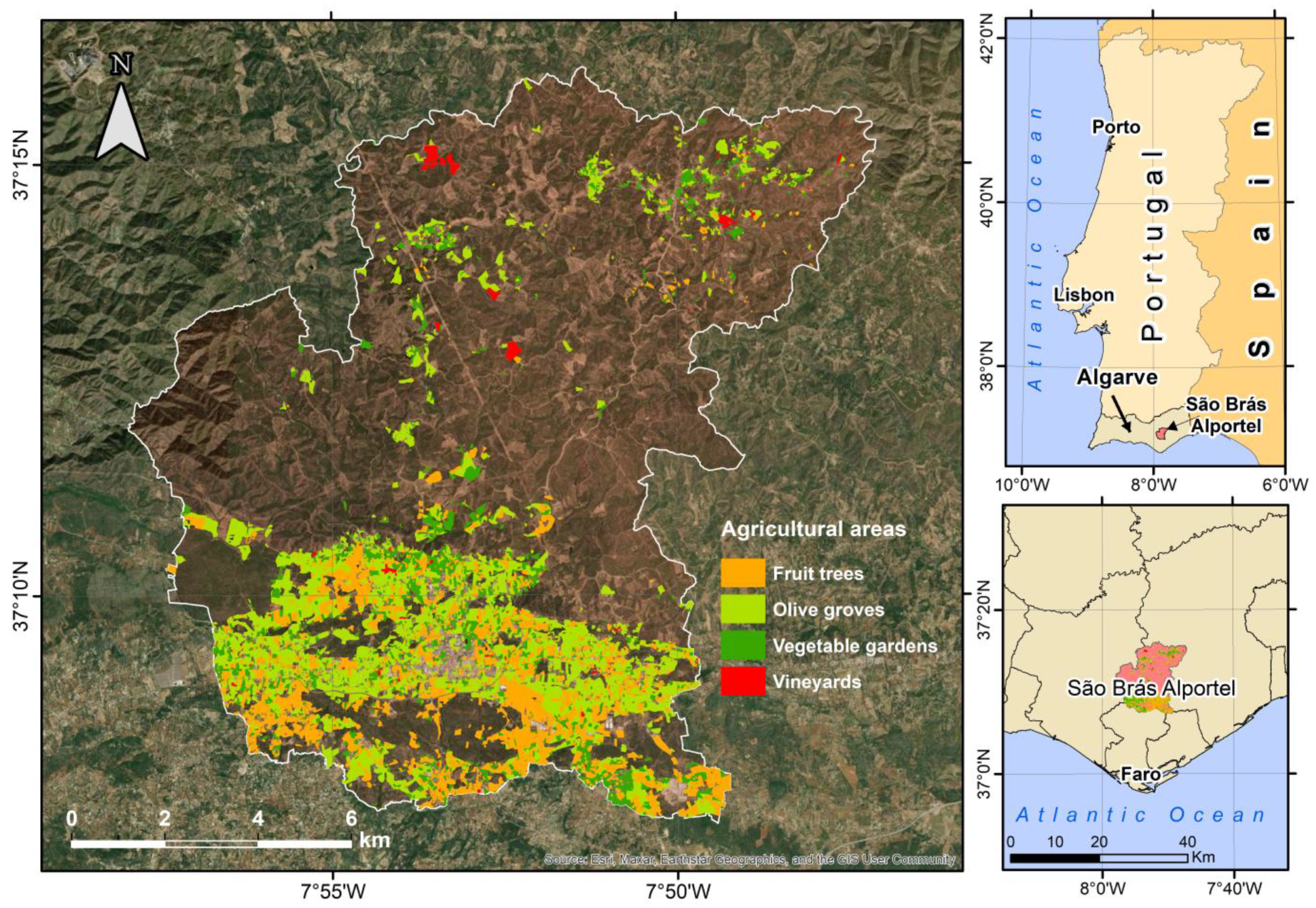 For this study, agricultural areas were delineated using the Portuguese Land Use and Land Cover Map (COS 2018, scale 1:25,000), the 2019 Cadastral Survey (scale 1:10,000), both produced by Direção Geral do Território (DGT), Portugal, and the 2020 Topographic Base Map (scale 1:10,000) produced by São Brás de Alportel Municipal Council (SBAMC). Approximately 27.3 km2 of the municipality is occupied by rainfed systems, whereas 1.6 km2 supports irrigated crops. Areas under fruit trees, vineyards, olive groves, and vegetable plots cover 9.6 km2, 0.6 km2, 14.4 km2, and 42.8 km2, respectively.