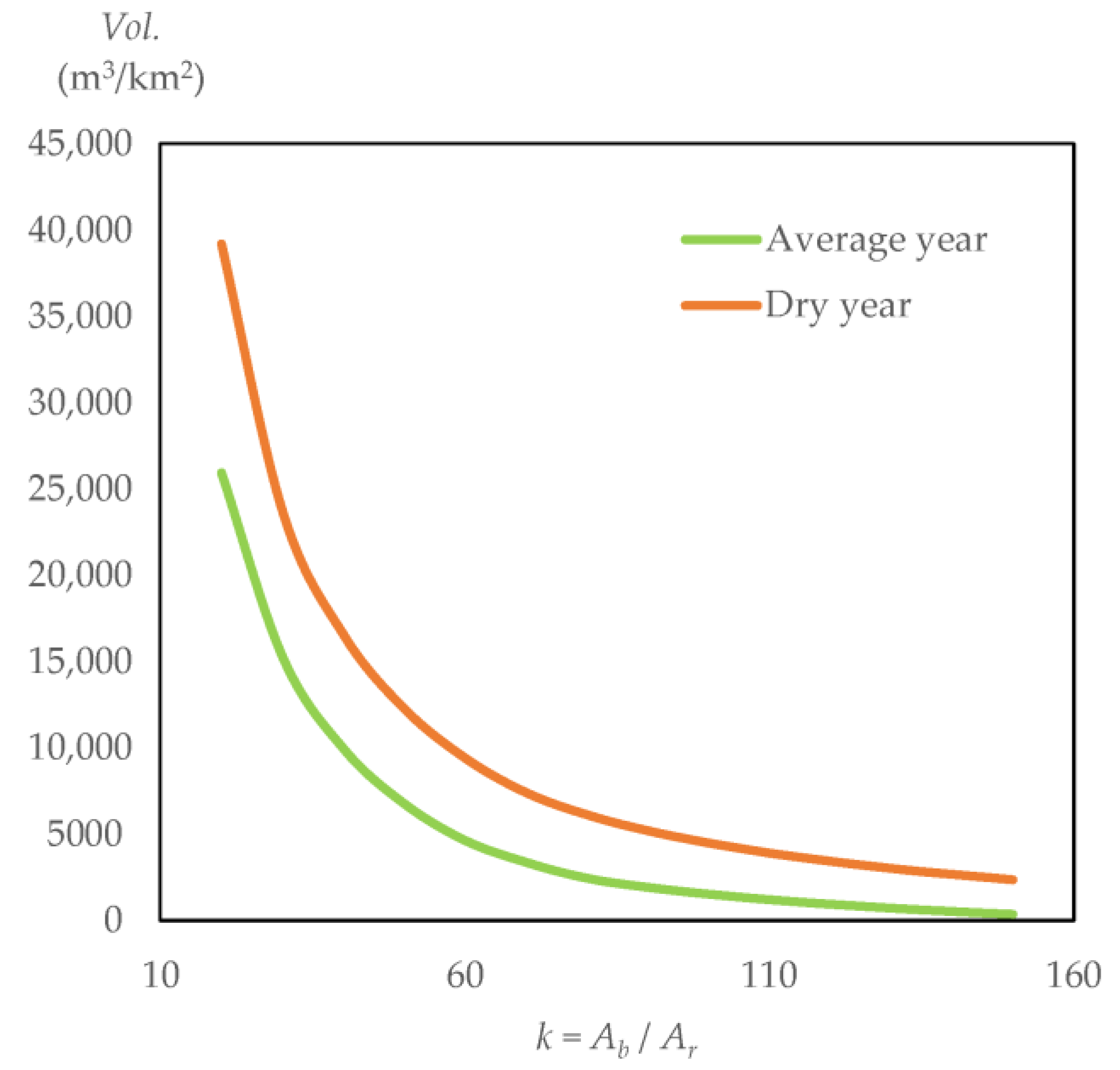 where ΔV is the change in stored volume (m3), Vin is the inflow volume (m3), and Vout is the outflow volume (m3). The inflow volume was calculated with Equation (3).
