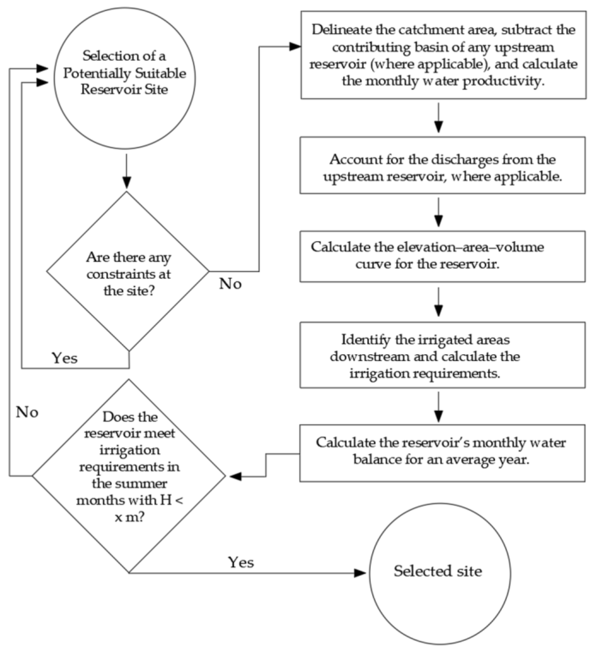 Additional siting criteria stipulated a 100 m buffer from roads and power lines, avoidance of land currently under cultivation, and preference for mountainous terrain with low permeability and adequate storage potential. Potential sites were limited to locations suitable for embankments up to 12 m high that would fill between January and February, maintain a positive annual water balance and permit gravity-fed irrigation of downstream parcels situated within 10 m of the channel.