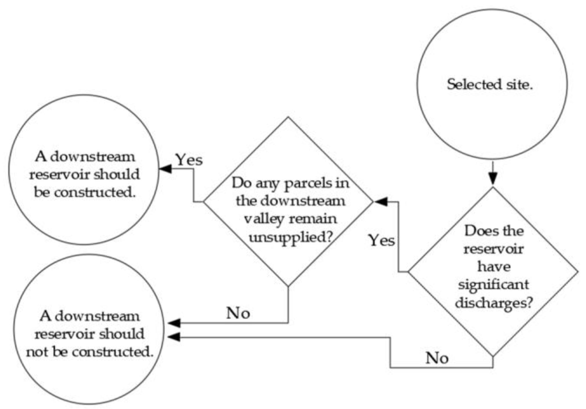 Micro-catchments were defined for all streams in the study area. For each candidate reservoir, the downstream drainage area and its flowline were delineated.