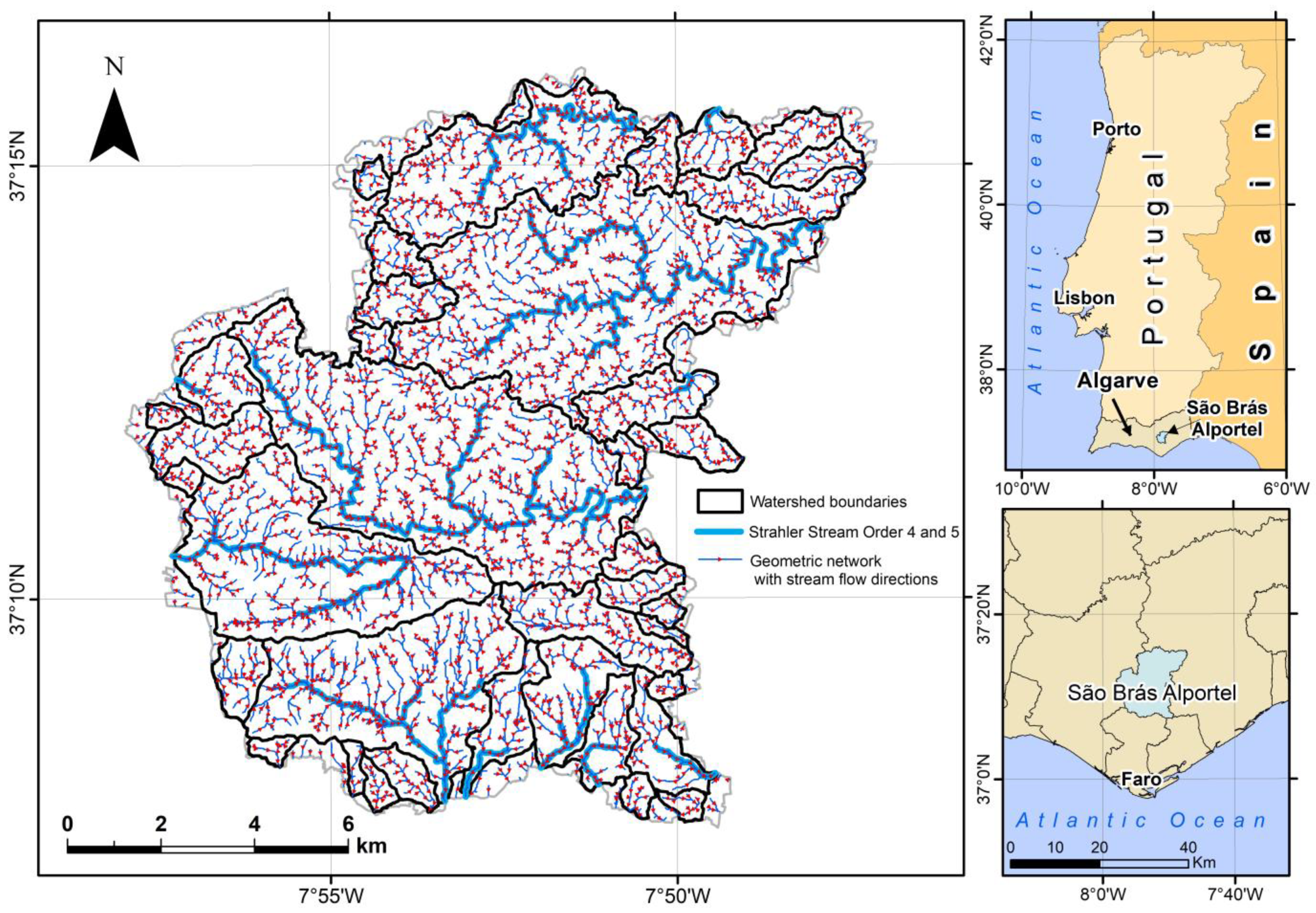 A drainage line was created for flow-accumulation values greater than 160 cells. This ArcGIS 10.8 (Esri, Redlands, CA, USA) hydrological parameter indicates the number of upstream raster cells draining to each location, thereby indicating where water tends to concentrate. The threshold was validated in the field by identifying a minor watercourse that the model confirmed at that accumulation value. Stream orders were assigned using the Strahler method, and the associated micro-catchments were delineated.