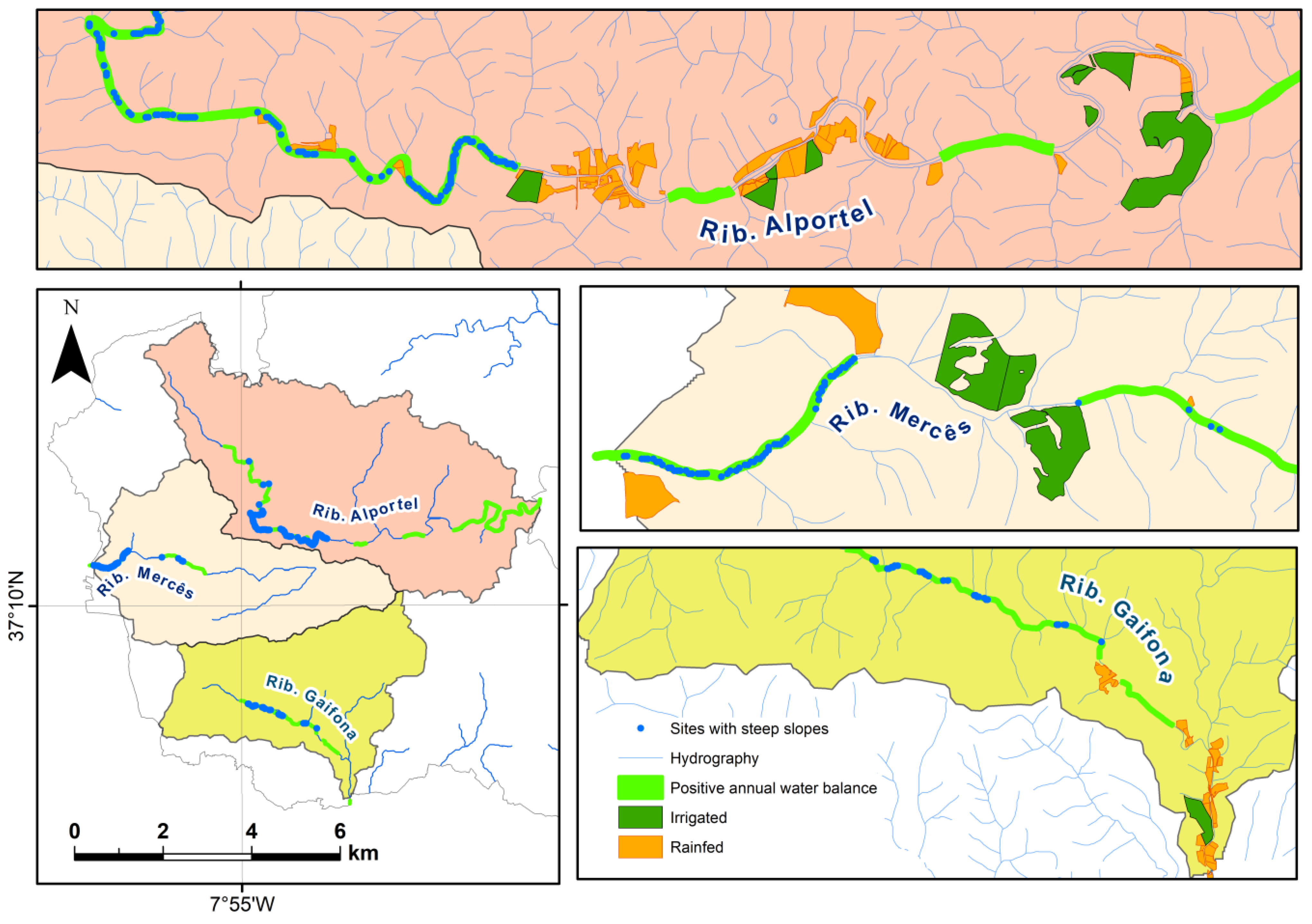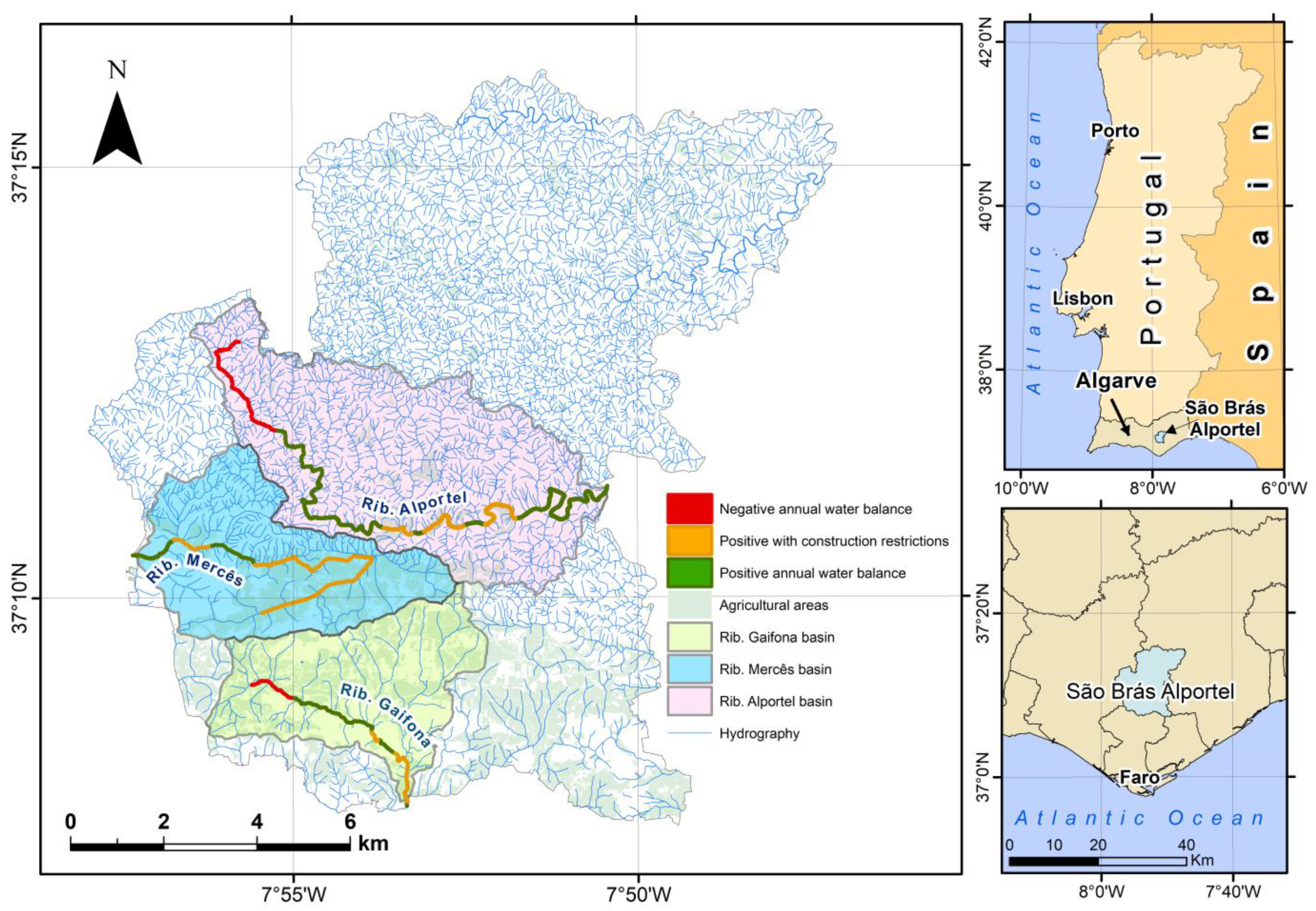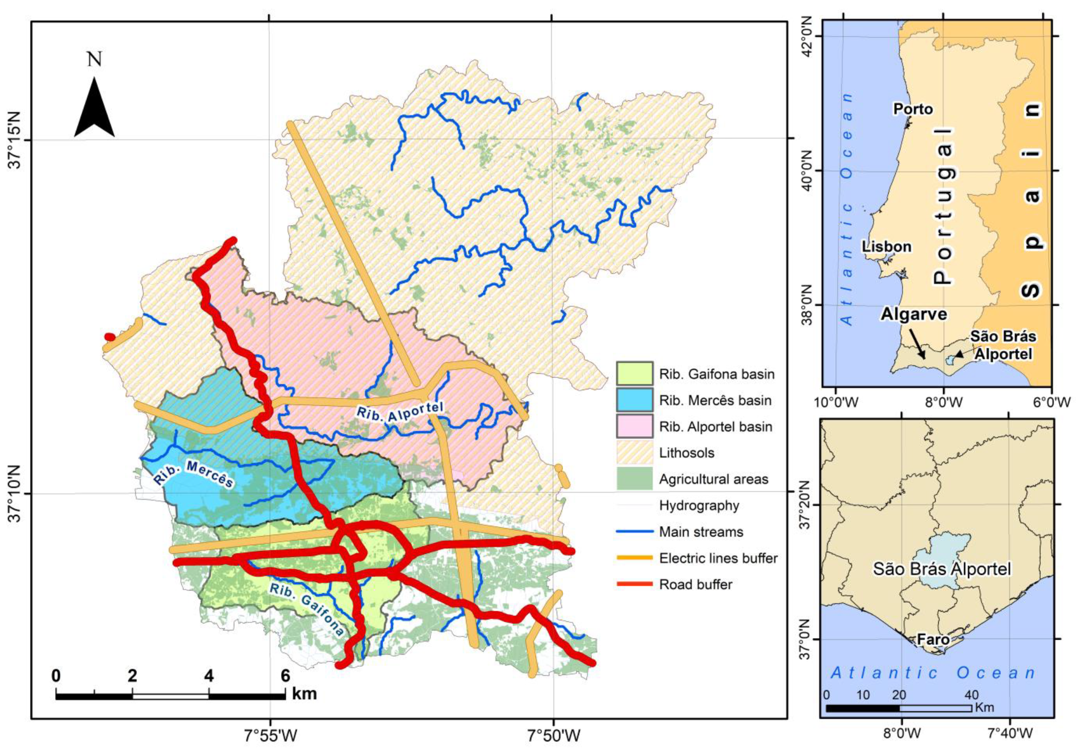 The São Brás de Alportel case study analysed here exemplifies these synergies. The municipality occupies an area between the Barrocal and Serra zones. In the northern Serra, higher elevations, steep slopes, and shallow, schistose soils limit agricultural activity. In contrast, the southern Barrocal is flatter, underlain by calcareous soils, and is more suitable for agriculture, particularly rainfed crops and orchards. The municipality lies across two drainage basins: the Algarve Coastal Streams basin and the Guadiana River basin. These basins are crucial for water supply, climate regulation, and environmental sustainability, directly impacting local livelihoods and the regional economy. The municipality is also served by a road network that ensures access to rural areas and potential reservoir sites, including National Road EN-2 and Municipal Road EM-270.