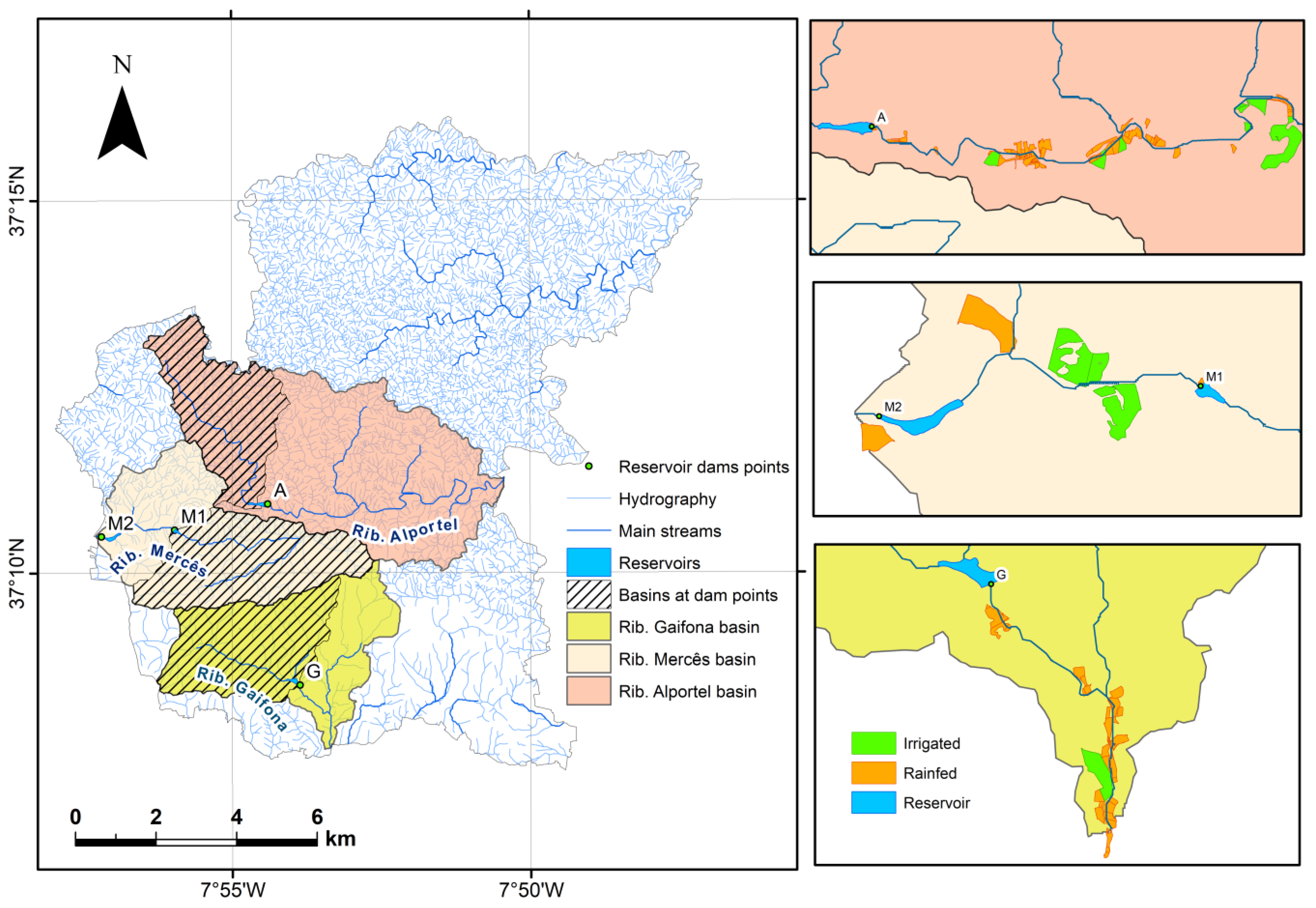 Mediterranean agricultural systems are facing an urgent water scarcity problem due to climate change, highly irregular rainfall, and increasing competition for water resources. In the Algarve region, annual precipitation averages around 560 mm, primarily occurring during the wet half-year. However, the hottest months often result in severe water deficits that compromise crop productivity, rendering rainfed agriculture increasingly unsustainable [1,2]. Severe drought episodes in 1993, 2005, 2012, and 2019, confirmed by the Palmer Drought Severity Index (PDSI) published by the Portuguese Institute for Sea and Atmosphere, illustrate the vulnerability of these systems, with a worsening trend observed in the monthly bulletins for 2023. Efficient water management, including reservoir planning and irrigation optimisation, is therefore essential to maintain agricultural sustainability and resilience [3].