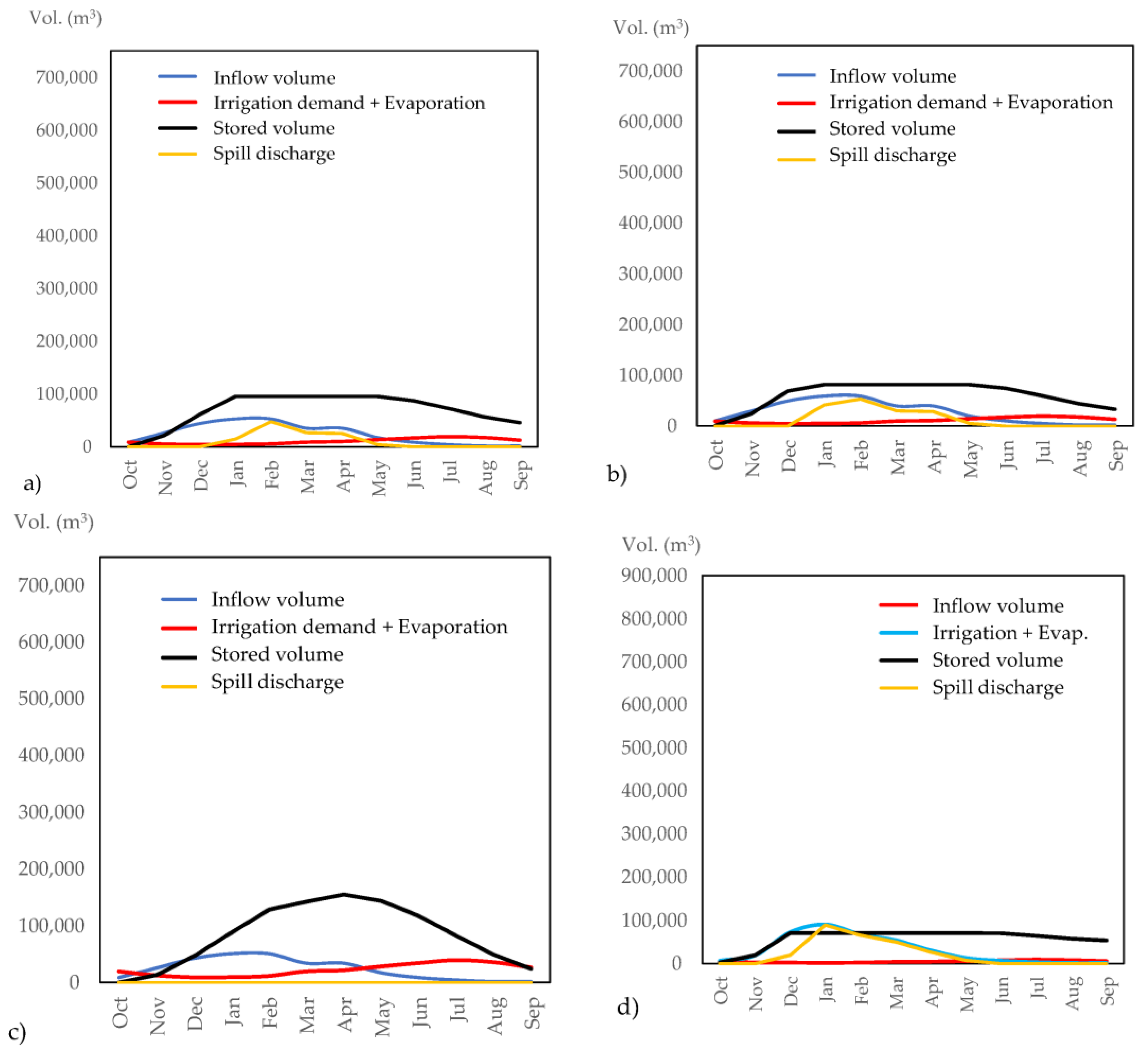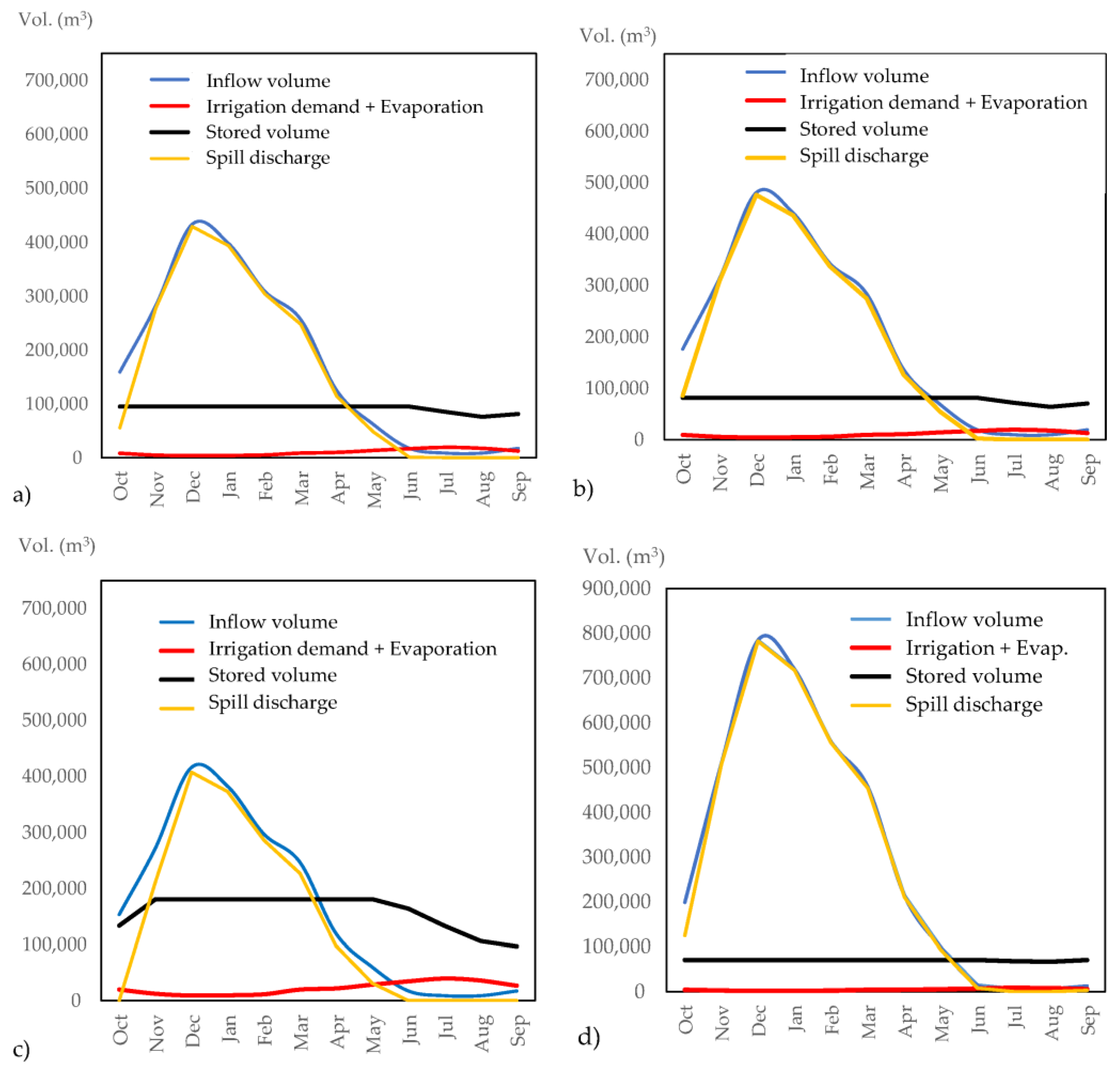 (1) Month; (2) Runoff * (mm); (3) ETo ** (mm); (4) Kc; (5) ETc (mm); (6) Pan evaporation *** (mm); (7) Reservoir evaporation (m3); (8) Irrigation demand (m3); (9) Inflow volume (m3); (10) Outflow volume (m3); (11) ΔV (m3); (12) Balance (m3); (13) Stored volume (m3); (14) Spill discharge (m3); * Mean monthly runoff—RH8, Arade catchment [22]; ** Mean monthly evapotranspiration—São Bartolomeu de Messines, 2006–2022 [28]; *** Monthly pan evaporation—São Brás de Alportel [24].