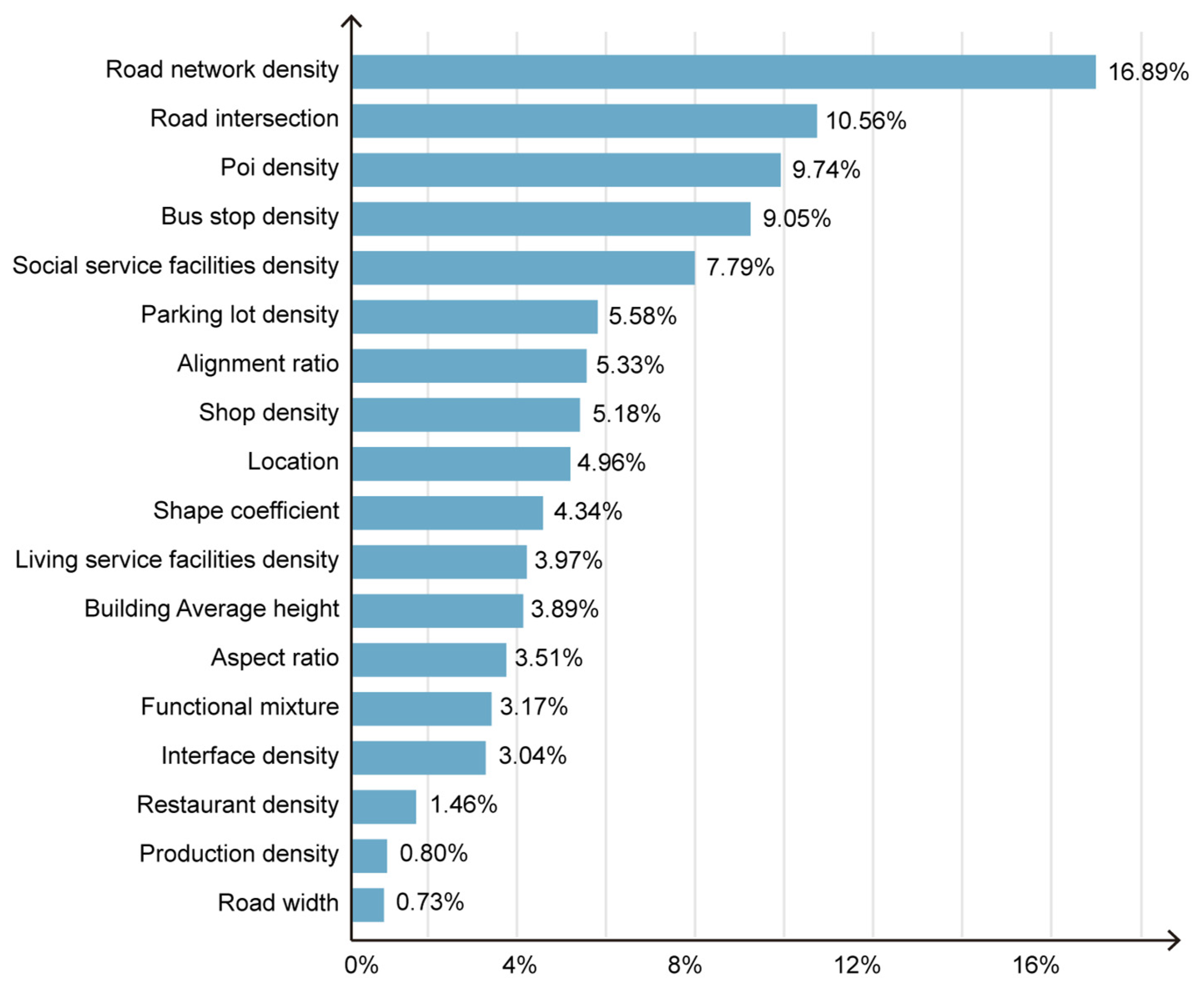 73]. This study assesses the relative importance of 17 street spatial element variables in terms of their contribution to the model’s predictive accuracy (