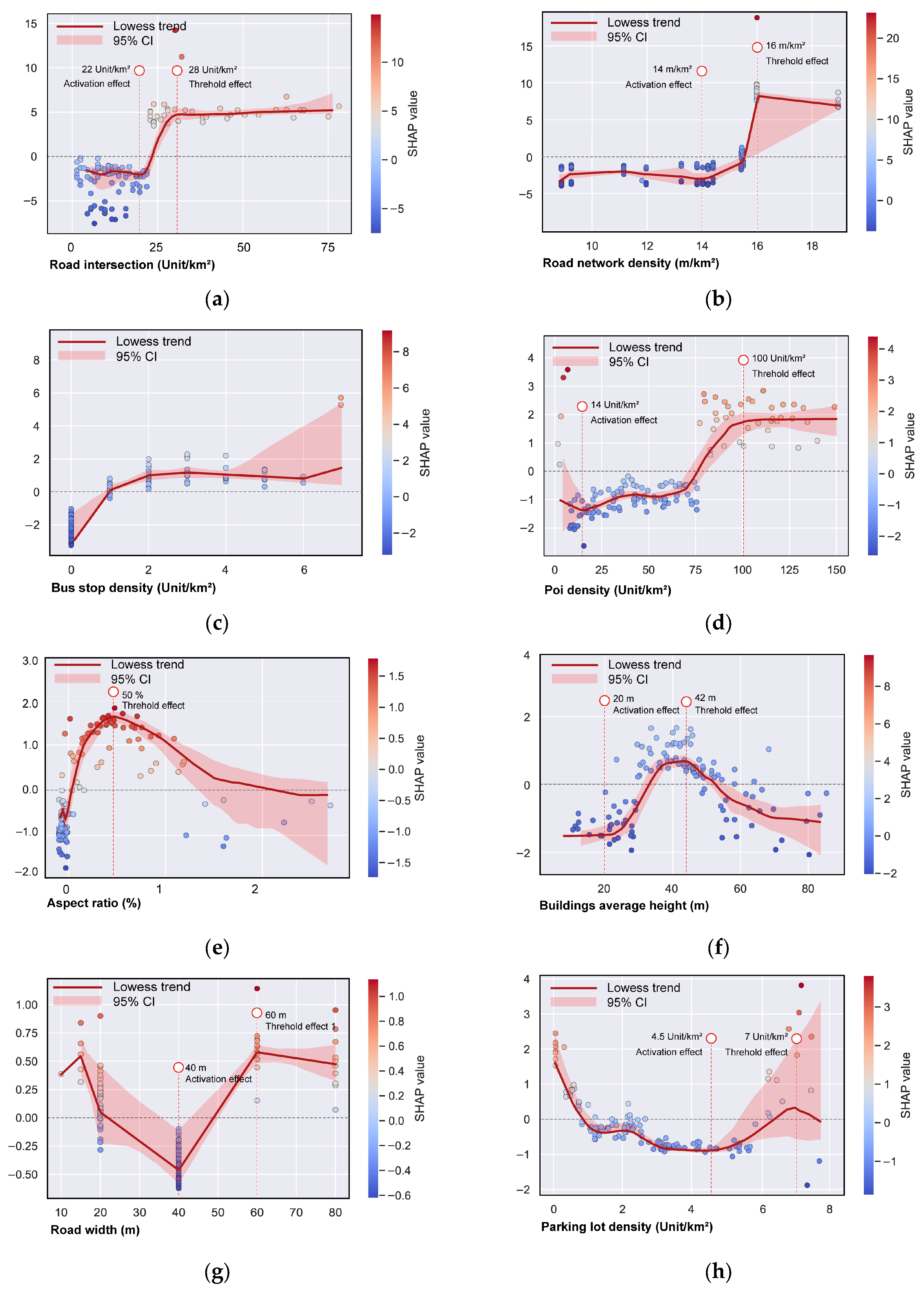 Hypothesis 1 posits that the relationship between key urban form characteristics—such as road network density, intersection count, and aspect ratio—and street vitality is nonlinear, marked by identifiable thresholds beyond which their influence diminishes, stabilizes, or reverses. This hypothesis is supported by evidence from the SHAP Dependence Plots (